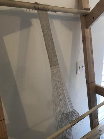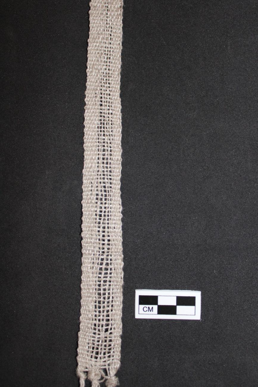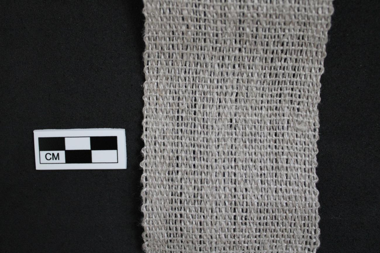 Once again, the crescents appeared to function well with this method. The shape of the crescents not only created a natural shed but also made it possible to create a tabby weave with only one row of loom weights (See Figure 15). As such, these crescents simplified the set-up process for warp-weighted weaving when compared to non-crescent shaped loom weights with one perforation, that often require two rows of loom weights and do not provide a natural shed. Despite this, the set-up process for this method was much more involved and time consuming than both of the other methods tested with these Iberian crescents. In large part, the set up was more involved because of the starting border and the increased number of warp threads and crescent weights that were used in this experiment. The set-up was further complicated by the addition of a heddle bar and the use of multiple threads on each of the weights that alternated between the two sheds. While the increased number of threads attached to each loom weigh made the warp tension used here lower than in the warp twinging method, this tension was still sufficient enough to keep the linen warp threads taut and did not noticeably impact the weaving process. Although more effort was required during the set-up, the weaving process itself was efficient and moved smoothly with the use of the heddle bar (See Figure 16). Adding more crescents, and as a result more warp threads, would make the set-up process longer but would have little effect on the weaving portion of this method. Compared to warp-twining, this method allowed for much less flexibility in the type of pattern that could easily be created but makes it possible to create wider fabrics with fewer loom weights. The fabric that resulted from this warp weighted weaving set-up turned out well and there were no issues with the fabric tapering inward or the selvages opening (See Figure 17).