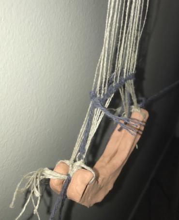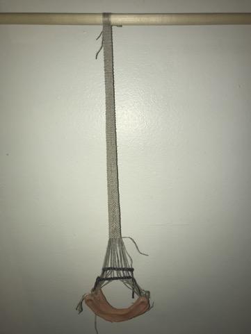 The first experiment tested the efficacy of these crescents in vertical band weaving. Twenty linen warp threads were tied to the top bar of the loom and attached to 2 loom weights with 10 threads on each weight (5 threads per perforation). Unlike the other experiments presented here, in this method the crescent weights were hung so that the long side of the weights were facing forward (See Figure 5). The 2 weights rested against each other and the warp threads were alternatively attached to each weight, with the first thread attached to the weight in front, then the next to the weight in the back, and repeating like this across the warp. As a result, the odd threads created the front shed and even threads created the back shed, with the first 10 warp threads attached to the perforations on the left-hand side of the crescents, and the remaining 10 warp threads attached to the perforations on the right-hand side. This set up resulted in about 5-5.2 g of tension per weight. A small floating heddle bar was added above the hanging crescents to create the counter shed while weaving. This method was used to make a band with a warp faced tabby weave.