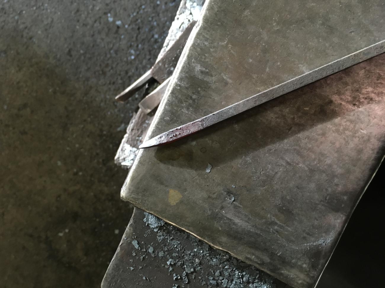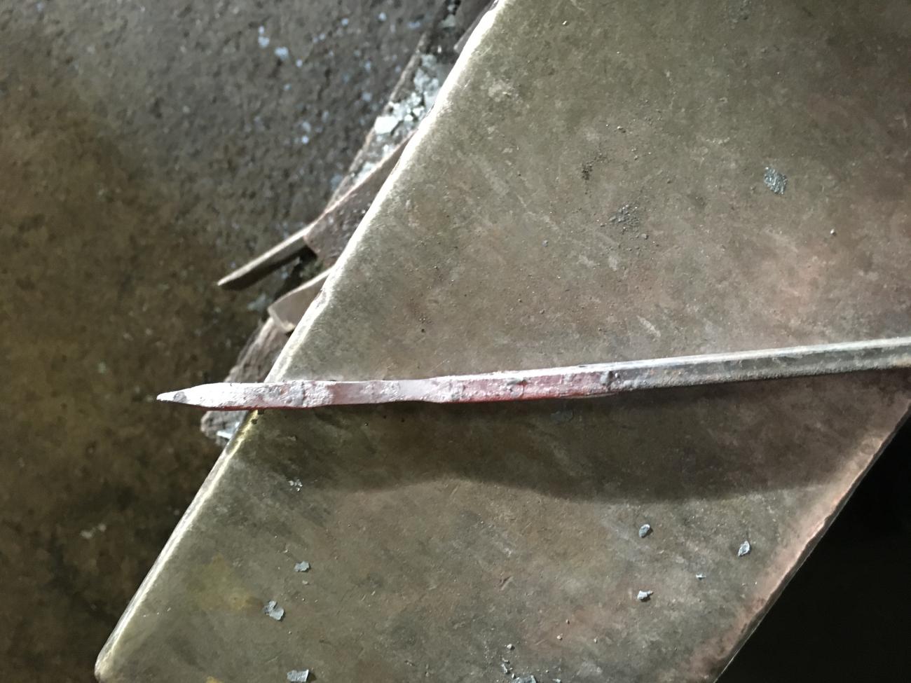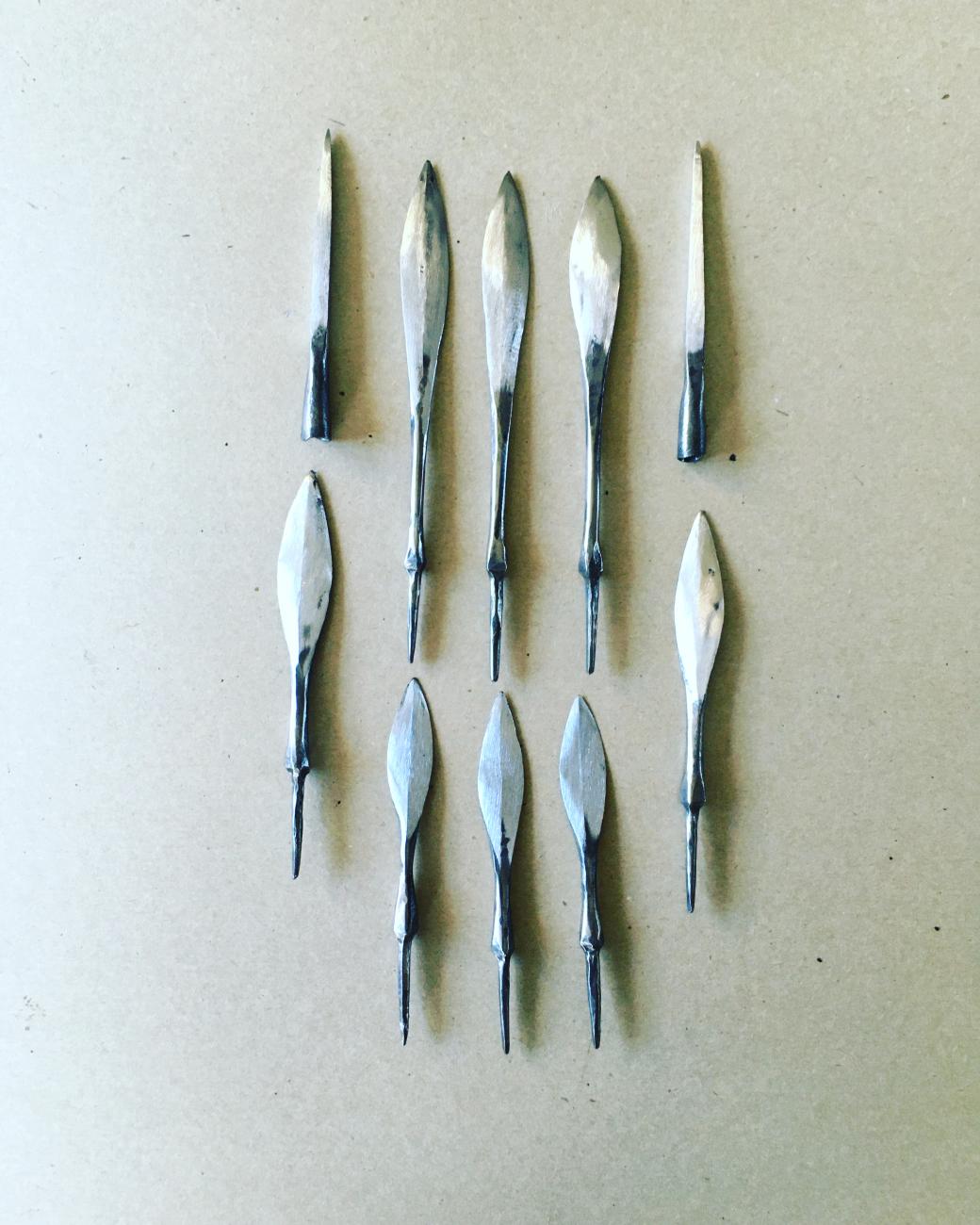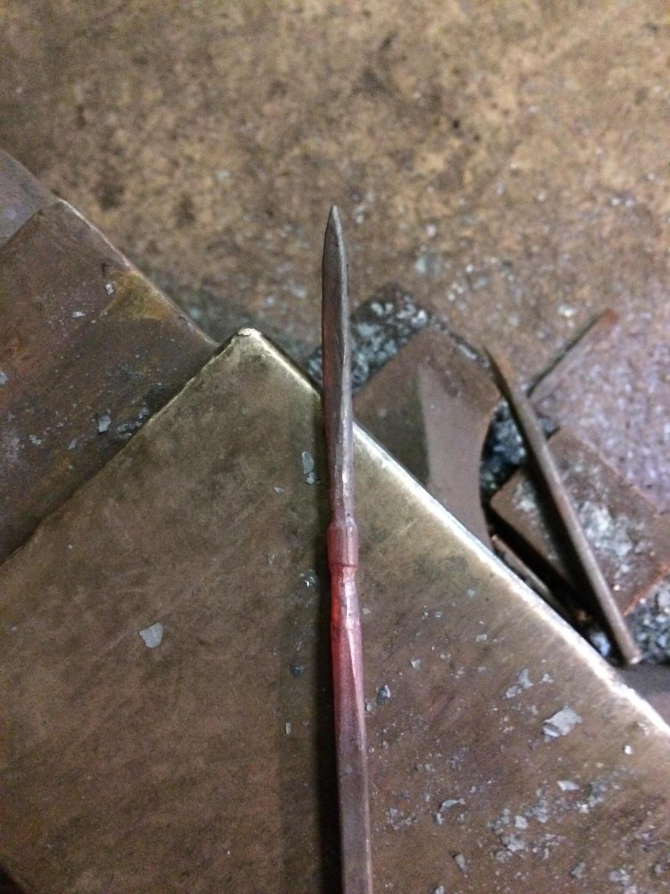 The triangular section blade also needs special tooling to achieve the correct section and the grooves on each face. The section of material needed to forge this arrowhead heads is 6 mm square.