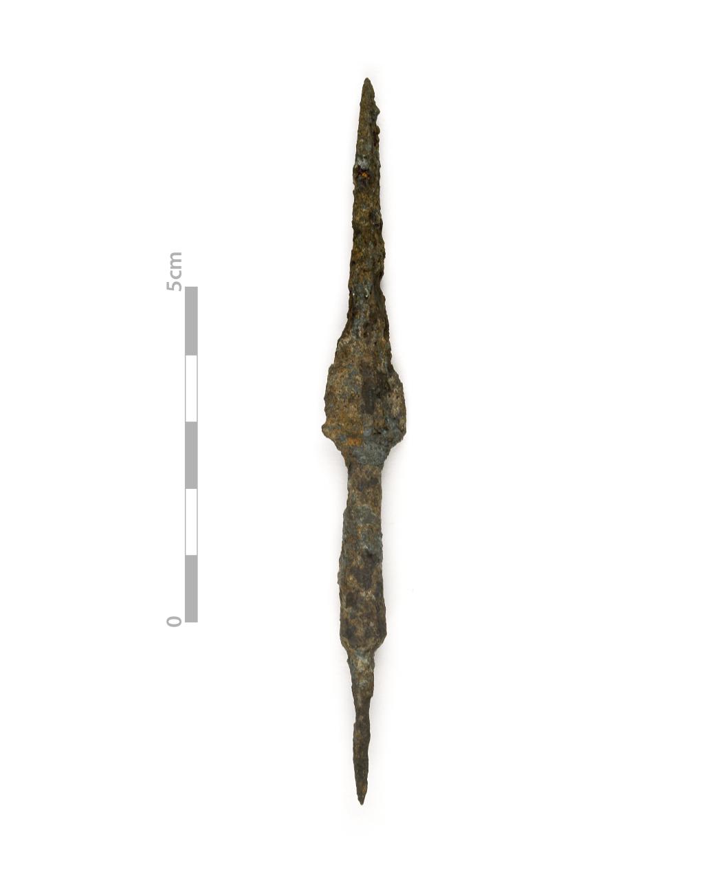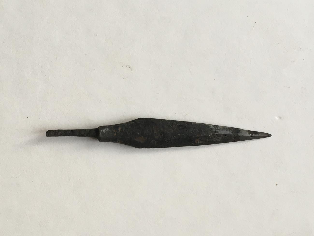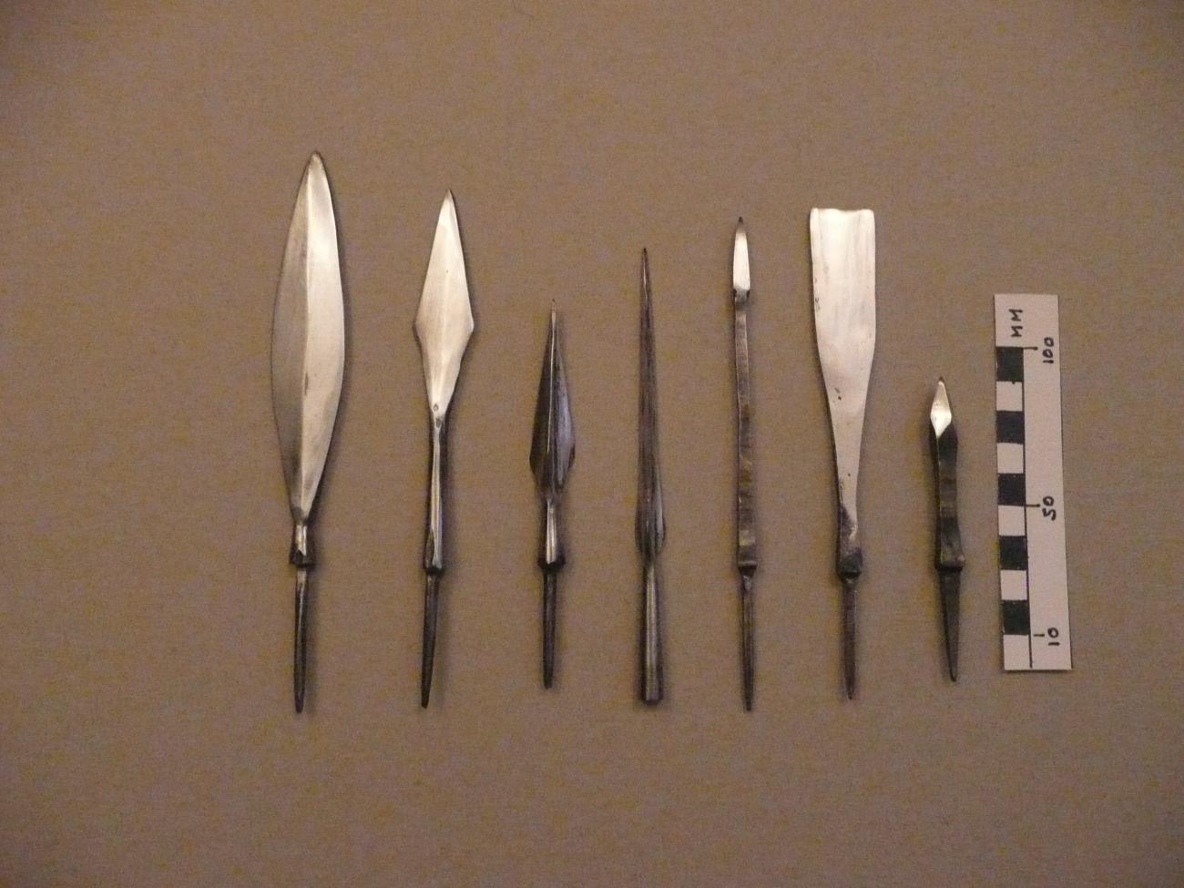 Many of the heads are tanged leaf shaped type A1. Four are socketed D1warheads and two are tanged A2 type hunting heads. A metallographic cross section of one of the heads shows it to be of sandwich construction with a medium carbon iron core between two pieces of low carbon iron. However, there is no evidence of any heat treatment being carried out on this head, but it has been cold worked to try and increase the hardness of the cutting edge.