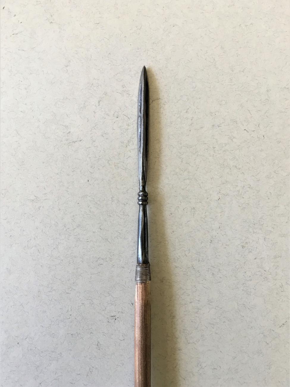 The majority of the Norse heads were fitted to the shafts by inserting a tang into the end of the shaft and binding it in with thread or wire. Some of the heads had flat tangs that were fitted into a slot in the end of the shaft and then bound on in the same way as the square or round section tangs. From a practical point of view the tang is quicker to forge than a socket, especially the flat tang, and more important at that time, uses less material that a socket. A disadvantage of the tang is that it takes longer to fit onto the shaft than a socket and requires a drill to make the hole in the end of the shaft. When fitting a socketed head all you need is a sharp knife and some glue to fix the head onto the shaft. It is interesting that the needle bodkins have sockets though they are crudely forged compared to the sockets of medieval arrows.