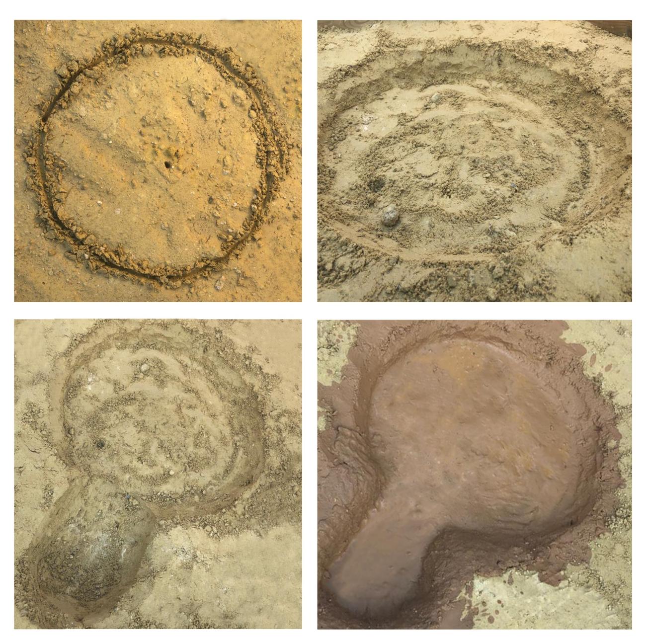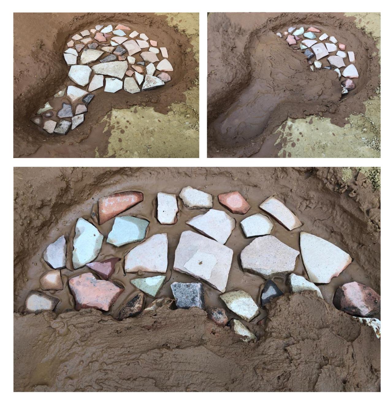 The floor plan of the circular oven was sketched on a tamped clay base measuring 30x90 cm (See Figure 1a-c) with a diameter of 85 cm, and an annexed exterior area measuring 20x22 cm. Both were covered in adobe (See Figure 1d). Subsequently, to give consistency and to regulate temperature in the lower part of the structure, the foundation layer was reinforced with ceramic fragments (See Figure 2) and covered with a thick clay and sand plaster. This provides a uniform working surface (See Figure 3). The oven walls were raised and inclined progressively towards the centre in layers of 5 cm high and 4 cm wide, until a height of 30 cm was reached. A formwork of small dry (although still slightly flexible) branches was used to increase the consistency of the walls during construction (See Figure 4). Once the process was completed (See Figure 5), the oven was left to dry and abandoned with no maintenance for 1 year to observe its process of gradual deterioration (See Figure 6). Only a first fire of short duration was carried out, but not a complete firing, in order to sufficiently harden the structure and contribute to its preservation. The aim was to determine if this type of adobe structure could resist exposure to rain and other meteorological (wind, drastic changes in temperature and humidity, etc.) and biological (growth of wild plants, insects and other animals, etc.) inclemencies without maintenance. After this phase, the structure was restored, eliminating outcroppings of salt (naturally present in the clay due to the proximity of the source to the ocean) and plant remains, as well as conducting the necessary repairs using the same adobe mixture originally employed in its construction (See Figure 7).