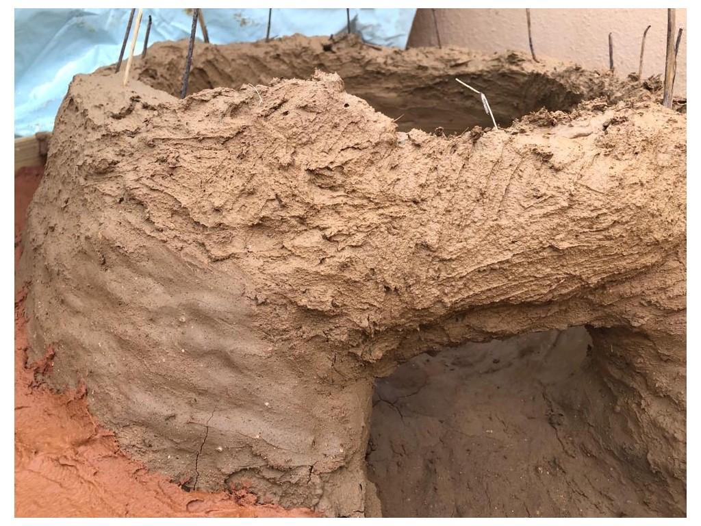 The clay was extracted from a source located in the western area of San Fernando (Cadiz, Spain), close to some well-known archaeological sites where several Punic and Phoenician pottery kilns (Villa Maruja – Janer) have been excavated over the recent decades in the insular part of the Bay of Cadiz (Bernal, et al., 2005; Sáez Romero and Belizón, 2018). Proximity to the extraction point speeds up production by providing abundant and immediate raw material. The other essential element for making adobe is vegetable fibre, which, in this case, was obtained through the collection of dry vegetation from the surrounding area. This element contributes to reaching the desired consistency in the mix of clay (marl) and sand. It was not necessary to add additional sand in this case since the local clay naturally contains a considerable amount of rounded quartz/quartzite sand (of less than 1 mm), typical of fluvial environments, which occasionally includes small pebbles of between 5-10 cm in length. The plant material was cut into portions of about 10-15 cm in length, mixing it with the sandy clay at a ratio of approximately one part plant to two parts clay. Some small branches and stems, thicker but flexible, with a greater length and consistency (up to 20-25 cm), were stored and later used as part of the "formwork" of the structure. Following the guidelines set by previous works (Weinstein, 1973; Crawford, 1981; Kramer, 1982; Mulder-Heymans, 2002; Rova, 2014), it was decided that the clay would not be subjected to decantation, since it was to be used as a raw construction component and small stones can provide additional consistency. Water was then added to the mixture until the right texture was achieved.