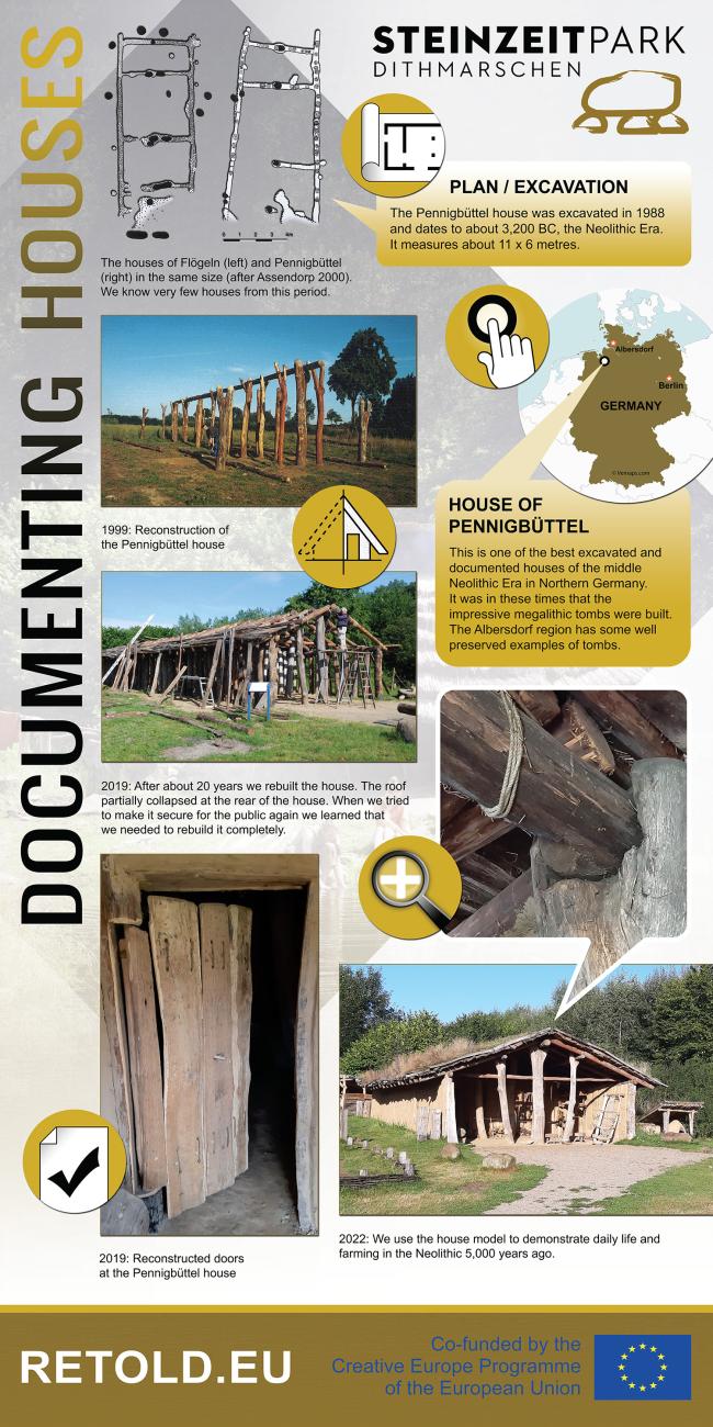 See Figure 2: “The “House of Pennigbüttel” is one of the best excavated and documented houses of the middle Neolithic Era in Northern Germany. Another reason was the unusual ground plan with three basic posts which allow reconstructing the roof with a heavy grass roof.”