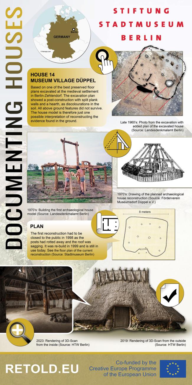 See Figure 1: “House 14 was chosen as a pilot study on new workflows for standardised documentation as part of the EU project RETOLD, as the excavation results showed it to have the clearest features of all house plans. The split plank walls are clearly visible, as are the main posts as well as the fireplace. The first reconstructive house model was built in 1974/5, it had to be re-built in 1999, as the roof construction had started to sag. The main posts were re-used from the original construction, although the rotten material was cut off so the re-used posts were shorter. The construction is yet again in need of being re-built. Preparing the taking down of the house, as well as the new construction of a house model, is another reason, why this house was chosen as a pilot for digital documentation.”
