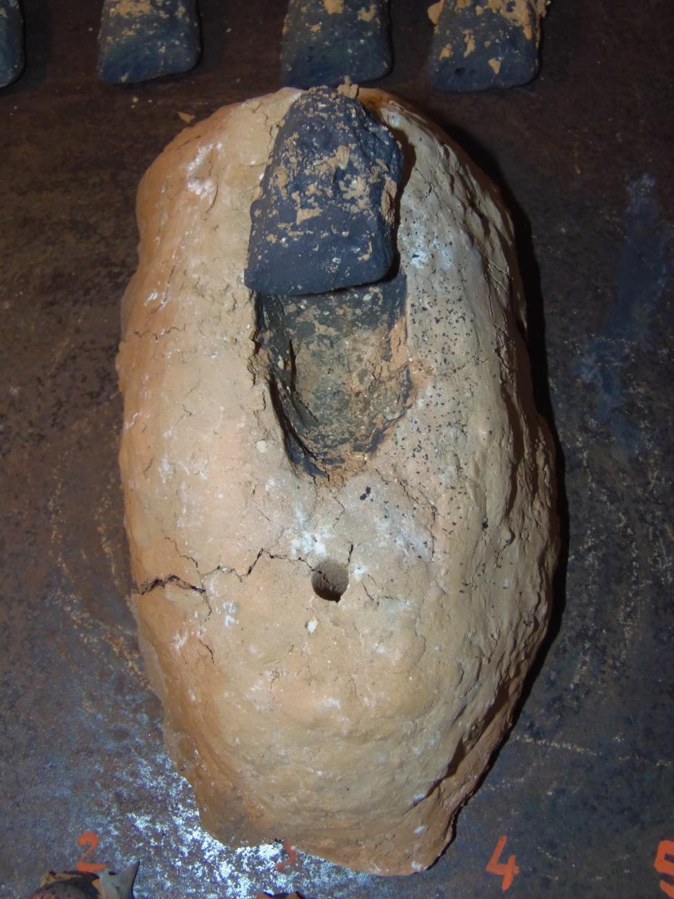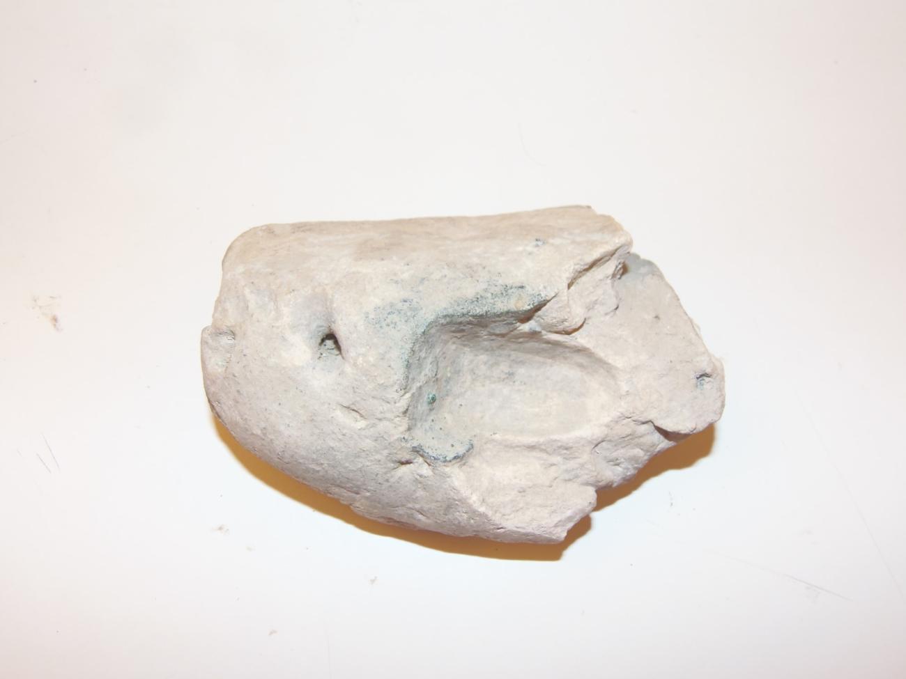 After an initial examination of the mould, the author found that it had been modelled by hand and that the central hollow was done by pressing a thumb on the wet clay (See Figure 1). A suspension hole survived and was showing traces of wear due to the sliding of a small rope, which suggested that the mould was either hung when not in use or designed to be carried from one place to another.