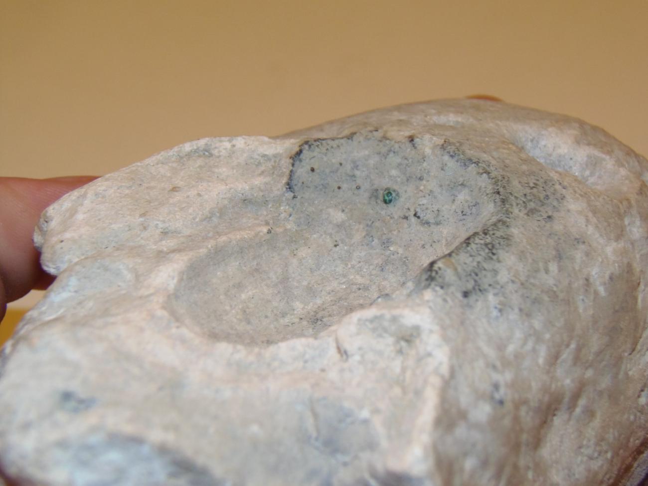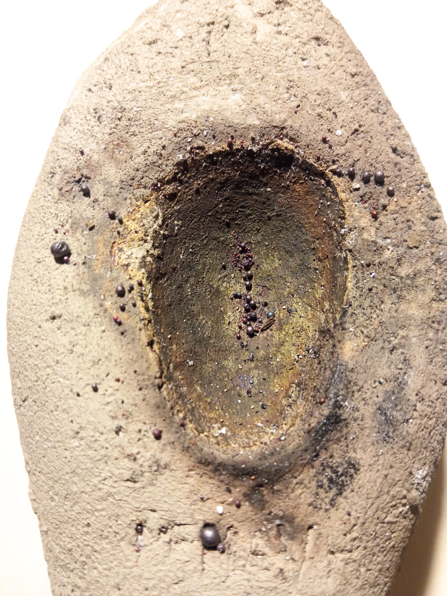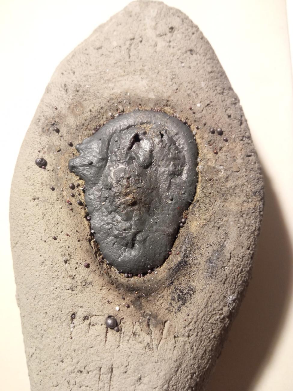 As said, prills like the ones on the specimen can be seen on the mould’s surface, and in the hollow. The hollow itself showed a change of colour and its surface has been darkened by the contact with the molten metal, showing dark-green marks that can be compared to those on the original.