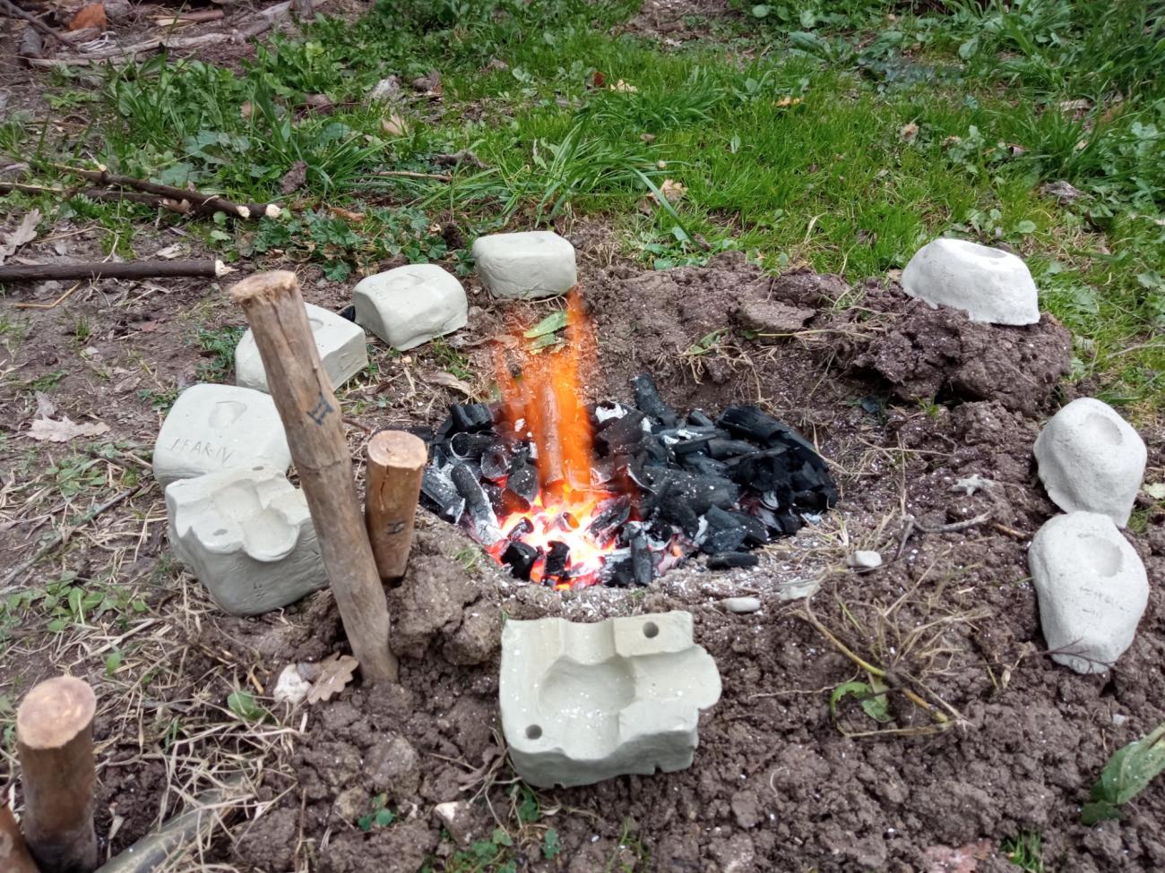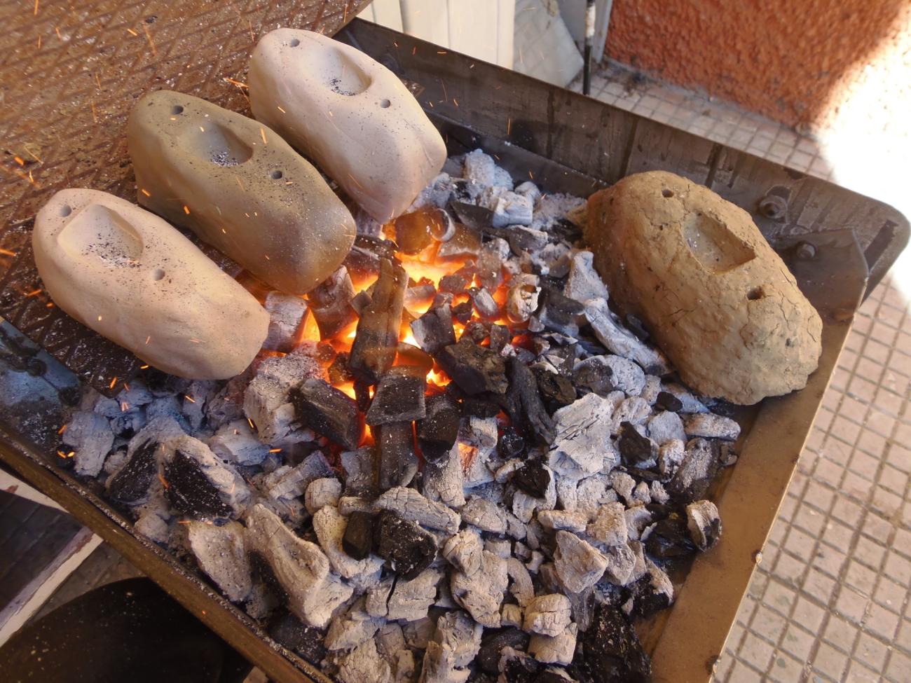 The moulds, and the replica of the Bronze Age clay crucible found at Moscosi di Cingoli (see below), were left to dry for 45 days (See Figure 6). They were fired using a manual forge and commercial charcoal, thus trying to replicate an open pit oven such as the ones attested in the Neolithic – Copper Age (Pignocchi, 1999, pp. 13-15) (See Figure 7).