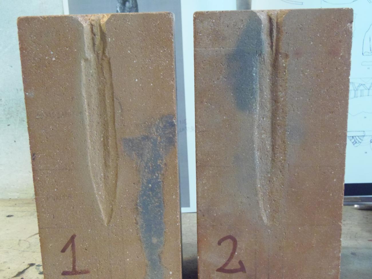 With regard to how MF MAV-II reacted to the castings, the first thing to note is that it shows little to no signs of wear. No cracks or other significant damage can be seen in the hollow or on the surface. The mould was not properly fired, just pre-heated before pouring metal in it, with a maximum recorded temperature of 189,1° C on its surface at the moment of casting F2 (See Figure 42). It seems, therefore, that the marl from Gubbio is a very strong and reliable material to use for making moulds.