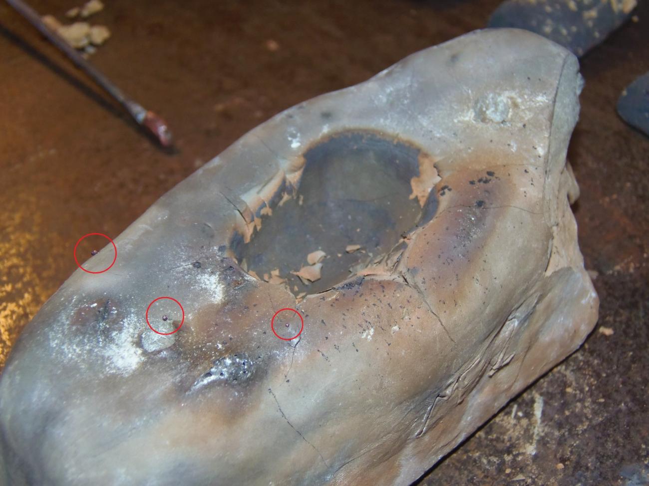 During all these castings the molten copper boiled, ejecting drops that would turn into metal spheres (prills) once cooled (See Video below). These can be seen on MF MAV-II and the nearby mould’s surfaces (See Figures 37 and 38), and have also been found and recovered from the terrain around the mould. This could be an important indication if another archaeological excavation takes place in the Baffoni Cave in the future. Finding such metal prills may help locate the furnace.