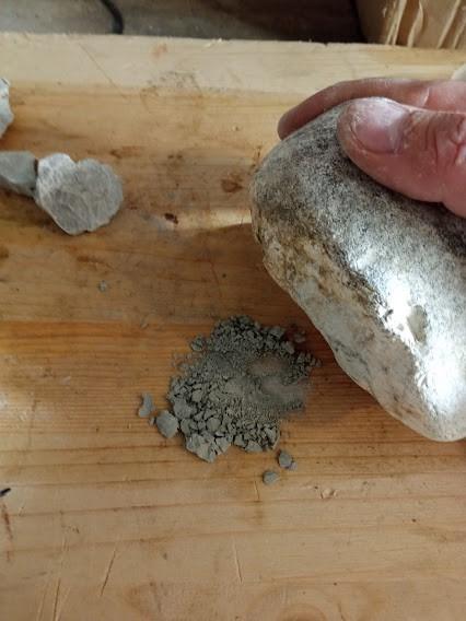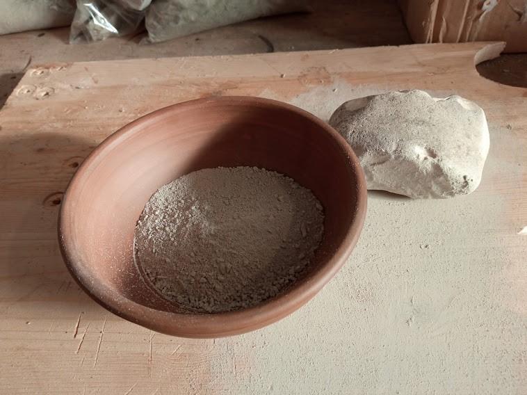 Considerable data were collected while working with marl. The marl from Apiro was formed of tiny greyish stones (similar to limestone) that were pulverized with a rock into fragments the size of table salt. The marl from Gubbio was naturally pulverised already, its consistency being the same as flour, and it was greenish in colour. In both cases two methods have been tried to add water. The first consisted in filling a 3 l cooking pot for one third of its depth and then putting 5 chunks of marl, total weight of 450 g in, letting them dissolve. The second was that the marls were put in another 3 l cooking pot and water was slowly added, mixing the paste by hand until it reached a ductile consistency, adding water or marl dust if deemed necessary.