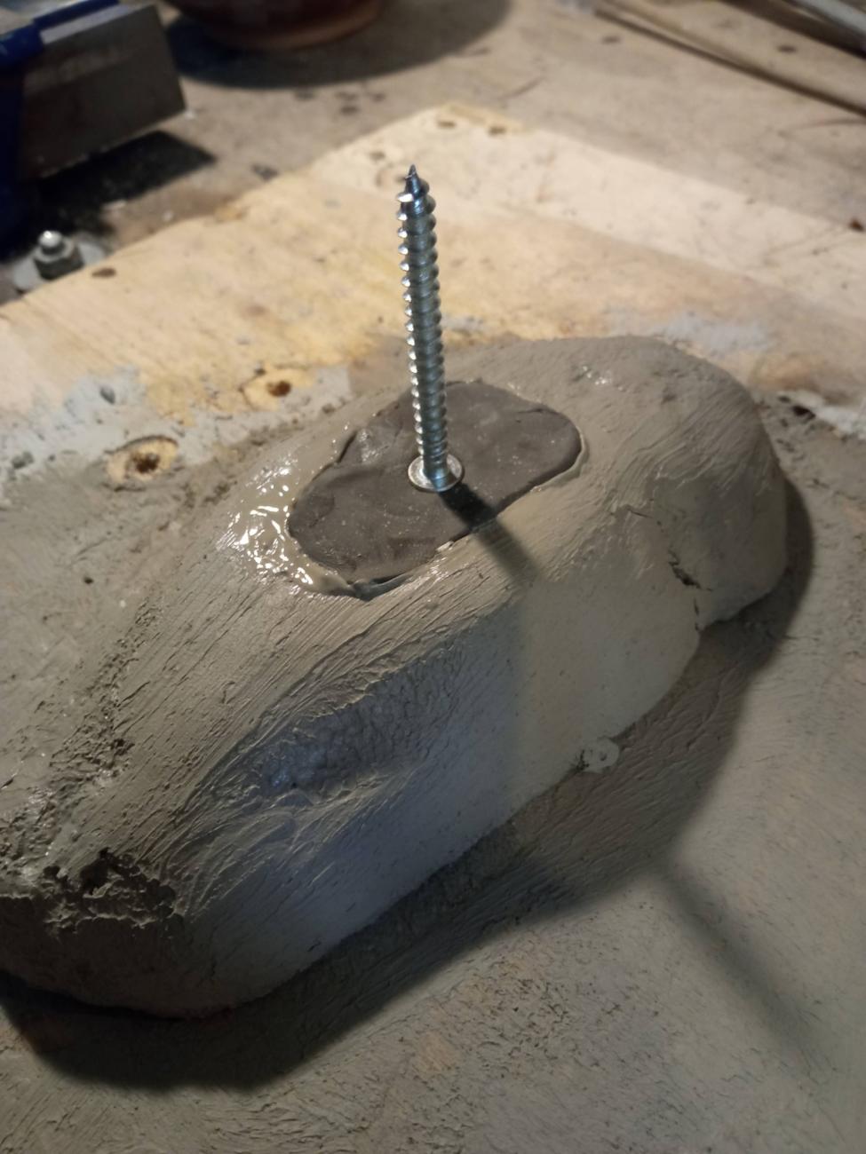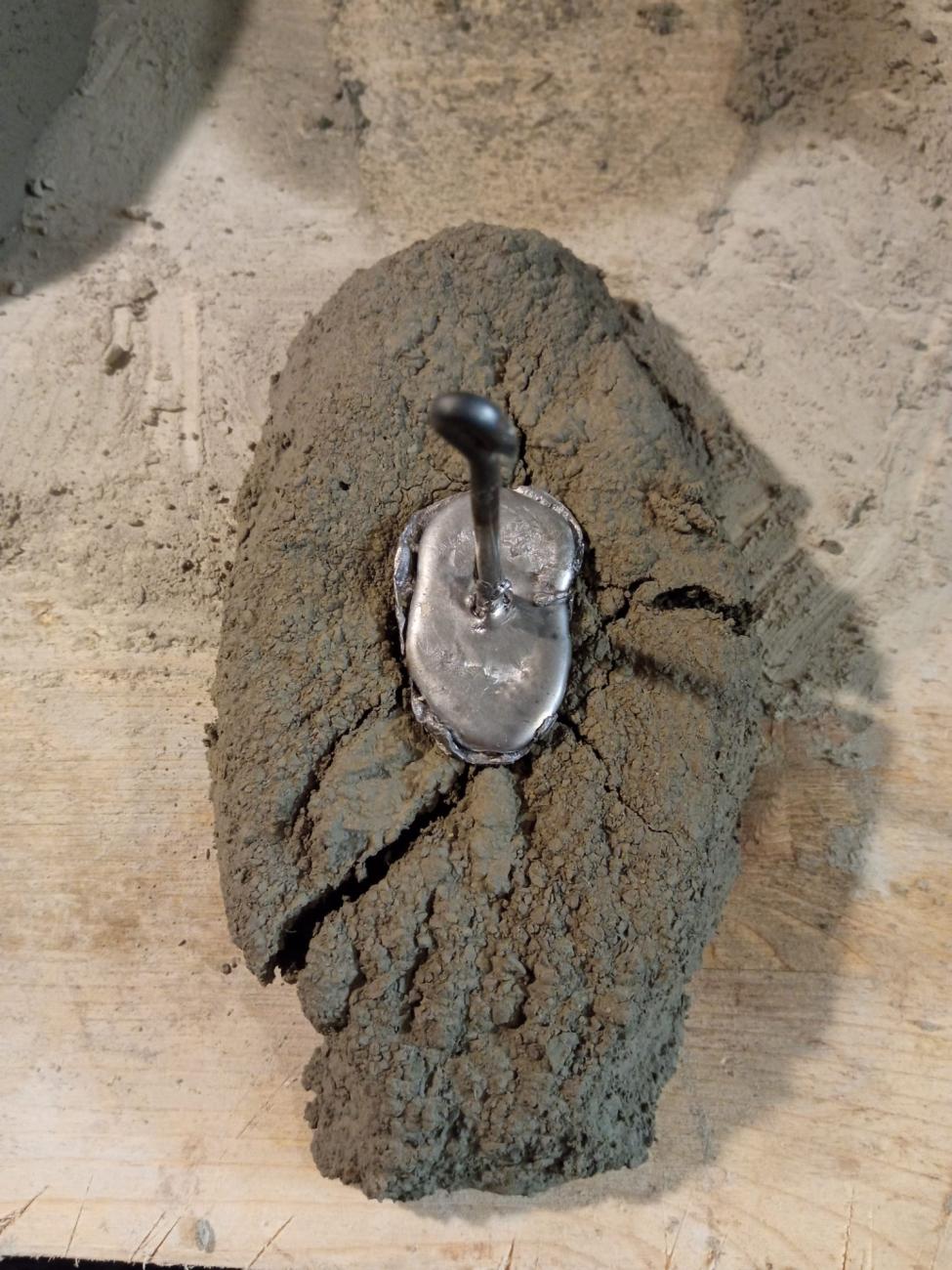 Some days later a pair of subtle cracks were noticed departing from each side of mould MF MA-2 (See Figure 23). The risk of the mould splitting in two halves was high, so the decision was taken to pour lead in the hollow. Even if it was not perfectly dry, such decision was taken because only another DAS piece survived and it would have been too risky to use it for a second mould, given that the first DAS piece was destroyed. Pouring lead into the hollow of MF MA-2 would have produced a metal stamp that could be used in the future to make as many moulds as needed, each one with the exact replica of the original hollow. The lead was melted using a blowtorch and poured into the hollow in which an iron nail was kept suspended upright. This way, once the lead cooled, it could be pulled out easily using the iron nail as a handle (See Figure 24). This low-temperature casting did not damage mould MF MA-2, but the cracks later caused it to split in two halves.
