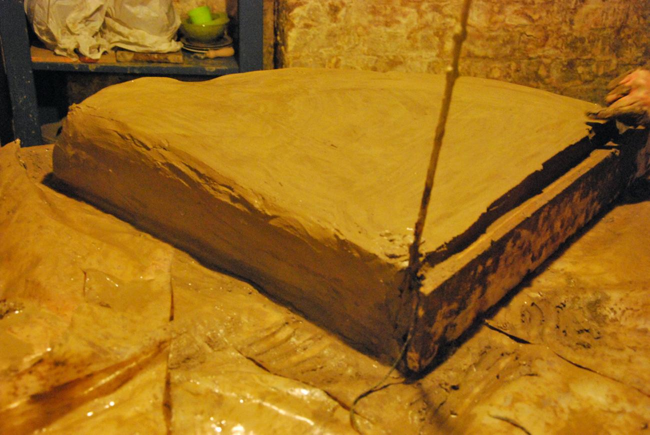 Making the perforated floor was a very laborious and time-consuming task since it required an average of three hours per day to mix and knead sand and clay and one hour to shape each section, for a total of seven days to complete it. Moreover, it took up to six months to completely dry them out, due to the thickness of the platform, the humid Manchester climate and the dump cellar where we stored them (See Figure 8).