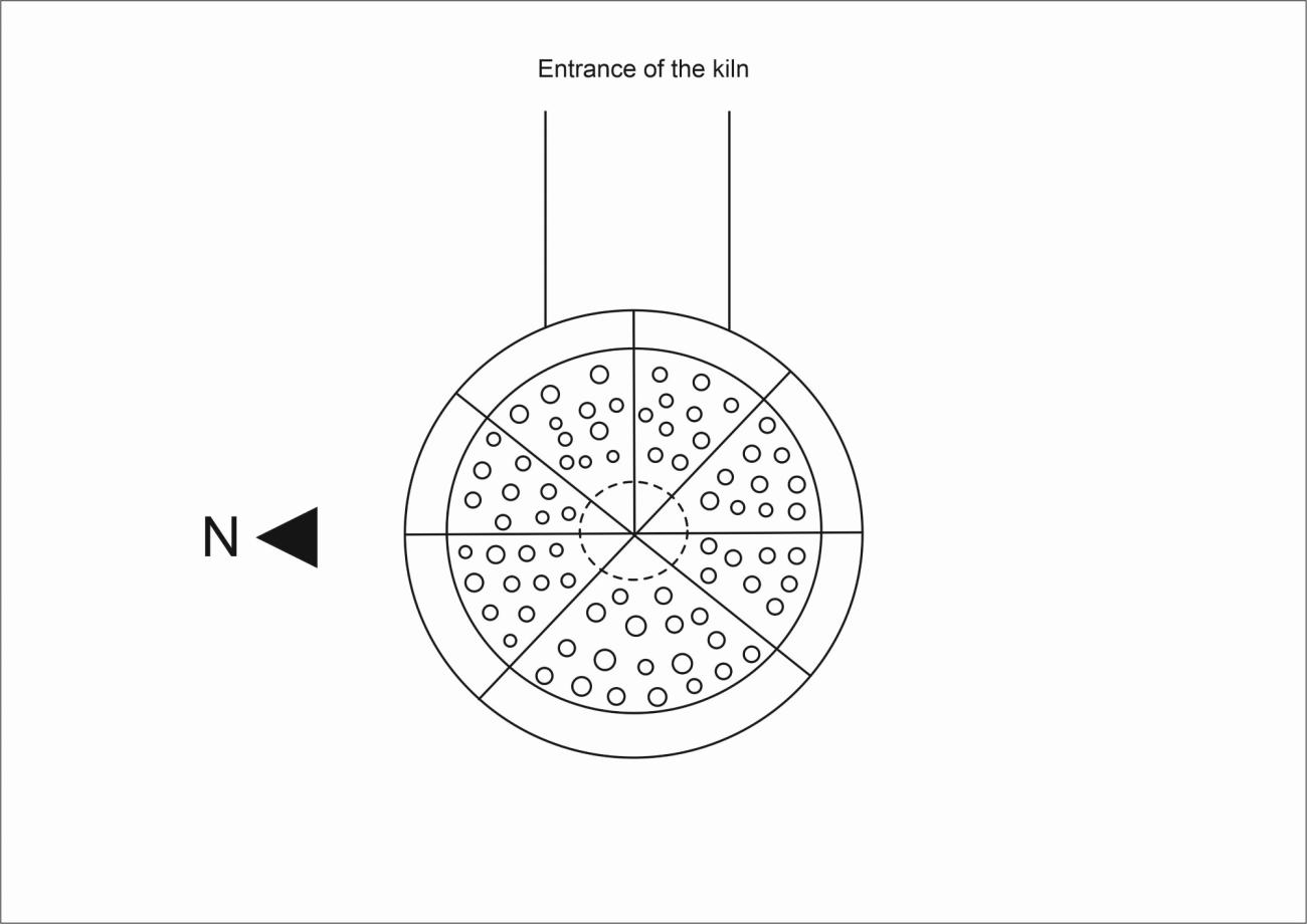 Our perforated floor was made with finely sieved local clay mixed with 30% of coarse building sand rich in quartz to produce a refractory clay body that could withstand thermal expansions and contractions due to heat and flame contact. We carefully kneaded big clay loaves to remove air pockets and, after having dampened them, we modelled each portion by sticking them together starting from the centre towards the external part. We placed a wooden stick at the centre of the working table and used a rotating cord to measure the radius of each module and, thus, the diameter of the entire floor (See Figure 6). We smoothed the surface of each portion and made the vent holes with a rod. The holes were between ca. 0.06 m and 0.08 m on the external edge to achieve a more homogeneous temperature across the firing chamber (See Figure 7). The holes, besides allowing the draft and the heat to reach the firing chamber, facilitated the drying of the clay body and helped avoid cracks and explosions in the platform during the firing.