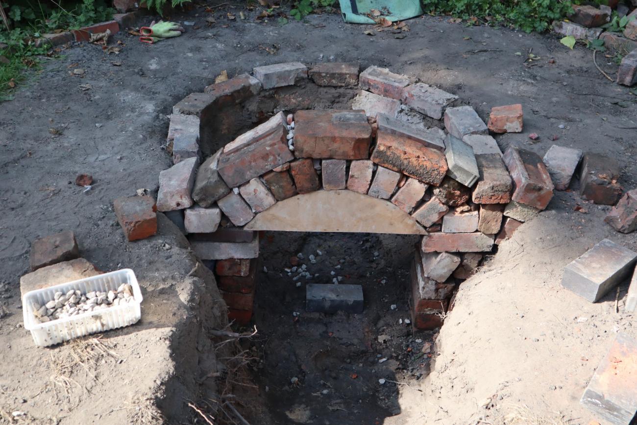 Following the archaeological evidence, we built an arch at the mouth of the combustion chamber as a connection with the stoking channel, sitting on two columns of Victorian bricks. The space between the combustion chamber floor and the arch is 0.62 cm, enough to let the draft go inside. We designed a wooden arch-shaped frame on which we placed two rows of bricks, vertically on the first row with a central brick in the vortex as a keystone and horizontally on the second one. The gaps between the bricks were filled with pebbles to keep the angles and allow the bricks to hold against each other, enhancing the stability of the arch (See Figure 12). Once the bricks were thoroughly arranged, we carefully pushed out the frame and reinforced it with more pebbles filling the remaining gaps. The structure successfully stood up thanks to the force produced by its own weight (See Figure 13).
