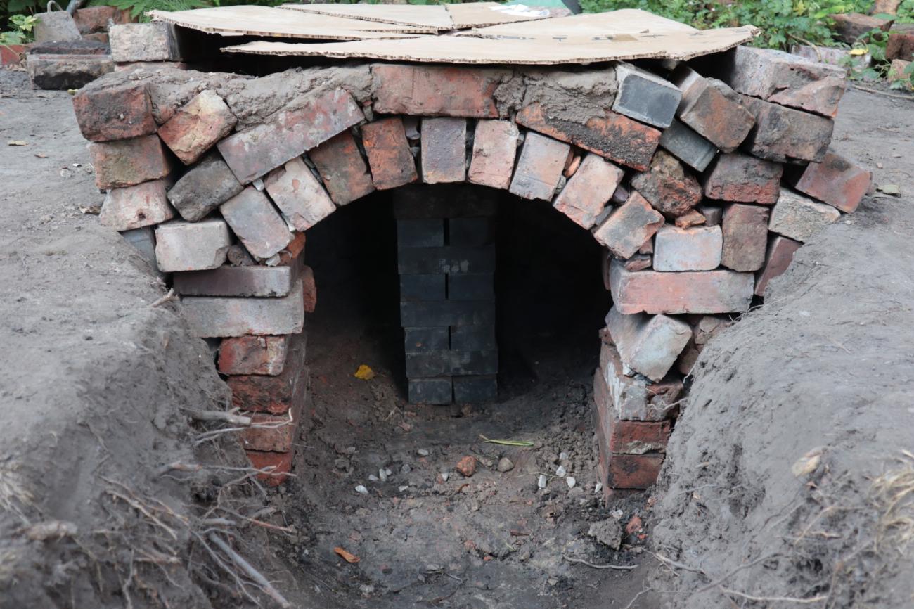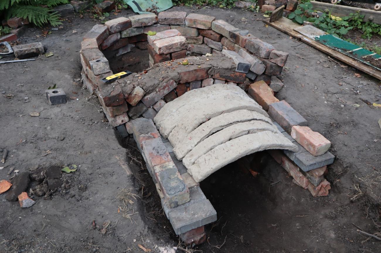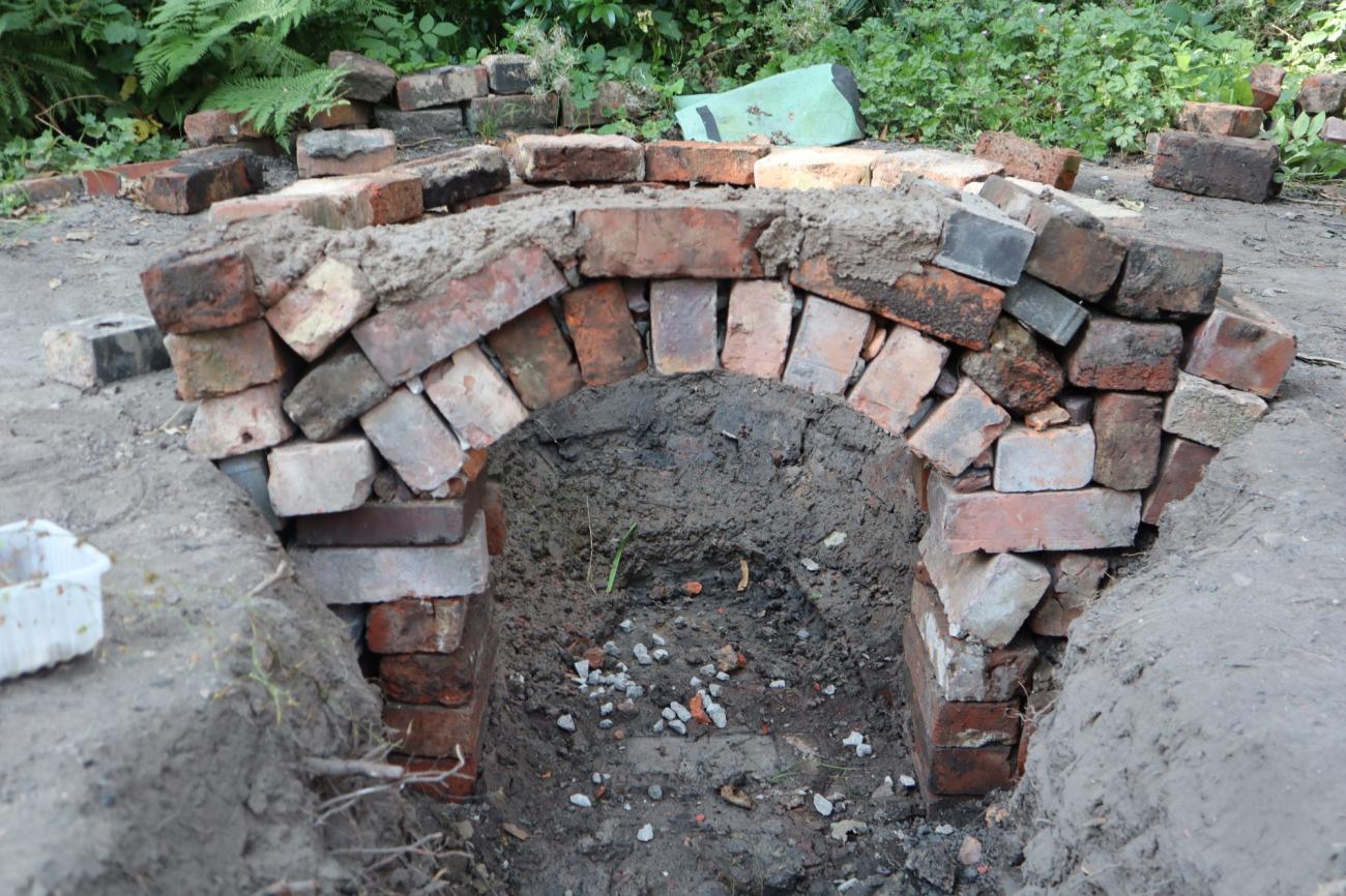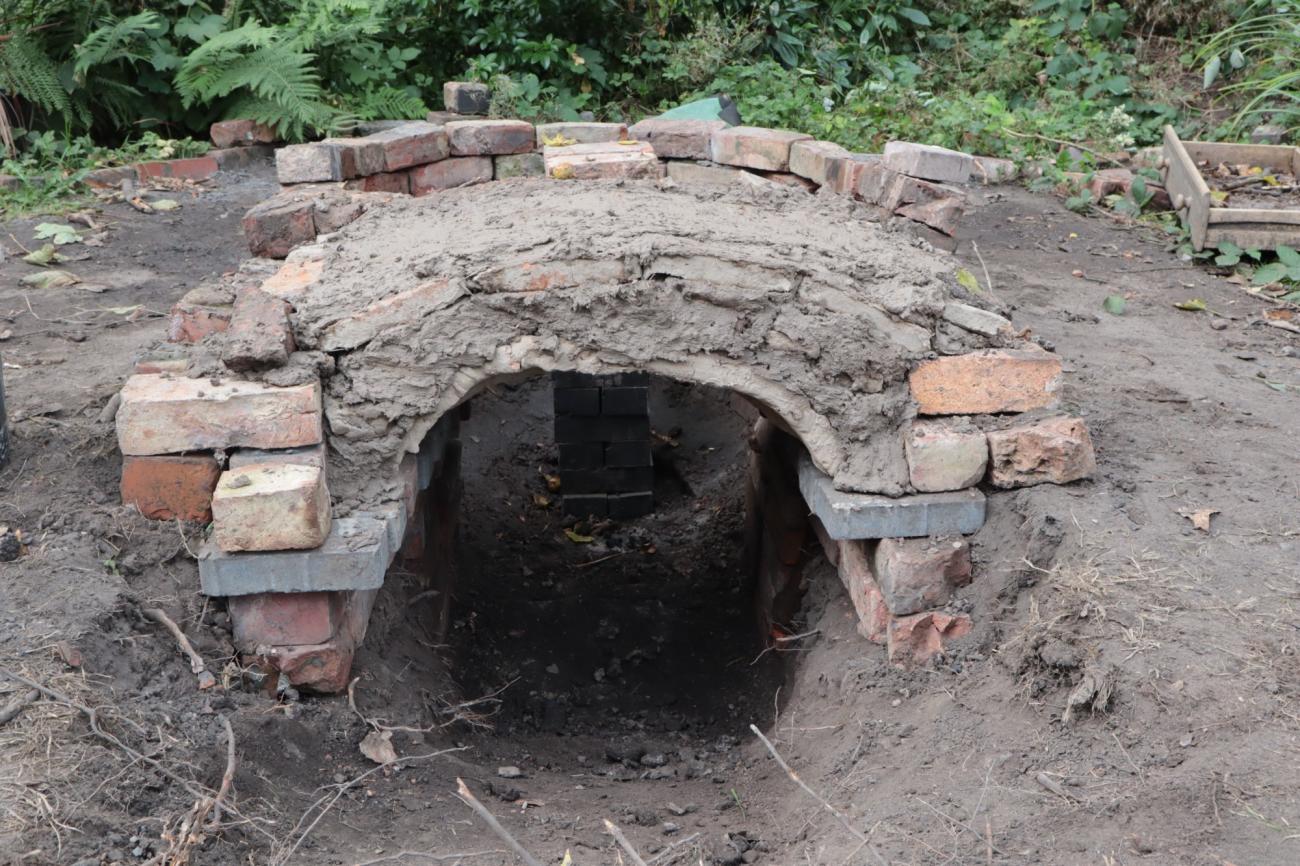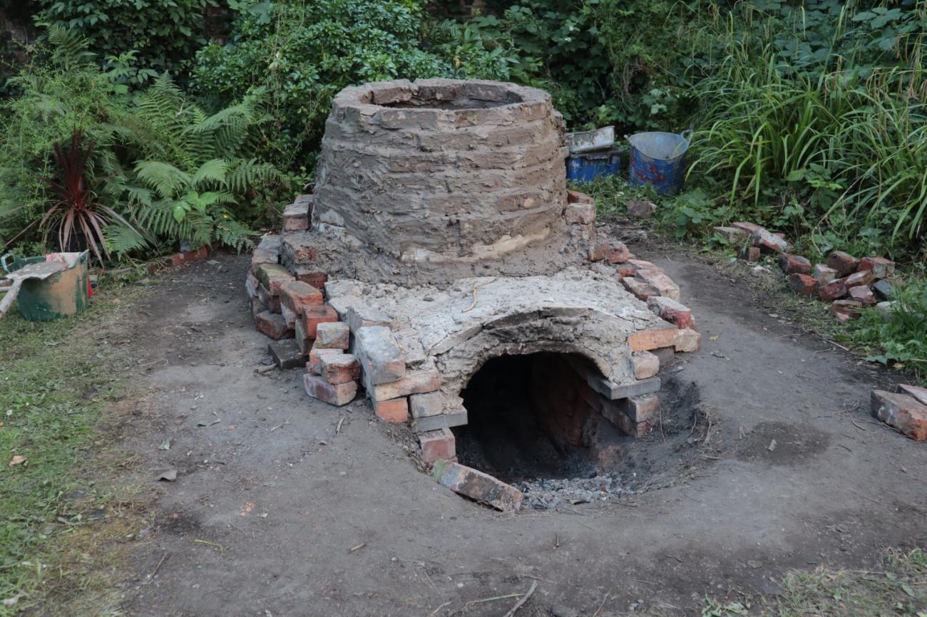 The intention was to build the central pillar and most of the kilnâs permanent structure with raw handmade bricks. However, we realised that the process cost a significant amount of time and energy, and the extreme humidity of the soil would have caused damage to the structure as it would make the raw bricks crumble. Therefore, fired Victorian bricks were a valuable and accessible resource from building sites in the neighbourhood. Their manufacturing process did not differ much from the ancient one, they had been fired in charcoal or coal kilns and they have refractory properties (Lynch, 2022). Consequently, we decided to use Victorian bricks to build the permanent structure, including the firing chamber and the central pillar supporting the perforated floor. In contrast, the less robust handmade bricks and adobe bricks were used to build part of the stoking channel and the dome.