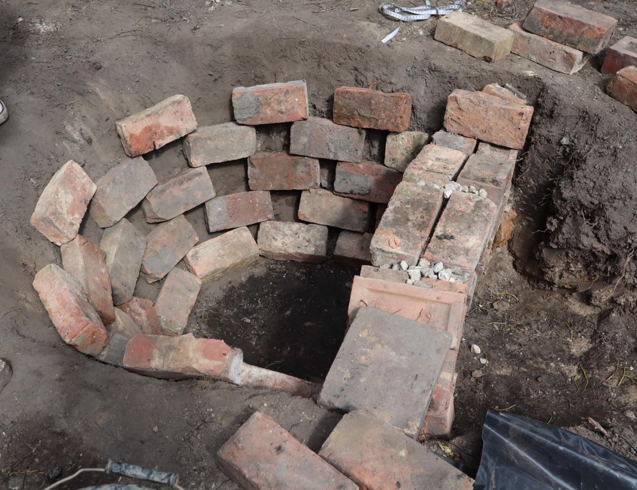 Afterwards, we built a provisional central pillar to support the perforated floor and tested its stability by placing two portions of the floor on top of it. However, it proved to be not safely stable. To solve that structural weakness, we covered the whole perimeter of the combustion chamber with Victorian bricks to make a circular wall to safely support the outer part of all the portions of the perforated floor, while all the central angles would rest on the central pillar. That circular wall started at the base of the combustion chamber, and it stood above the ground as high as the top of the stoking channel arch to provide a horizontal sit for the perforated floor portions. The wall section underground, at the level of the combustion chamber, was laid using the technique called âHit and Miss Brickworkâ. The resulting gaps were filled with a cocciopesto lining (See Figure 14). Cocciopesto is a mixture of clay, finely mashed bricks- using a spade- and water, which is necessary to make the mixture softer and more manageable. The mashed bricks make the mixture somewhat impermeable and refractory. We applied a 0.02-0.03 m layer of cocciopesto also on the combustion chamber floor to possibly avoid flooding, which may happen in case of heavy rains (See Figure 15).