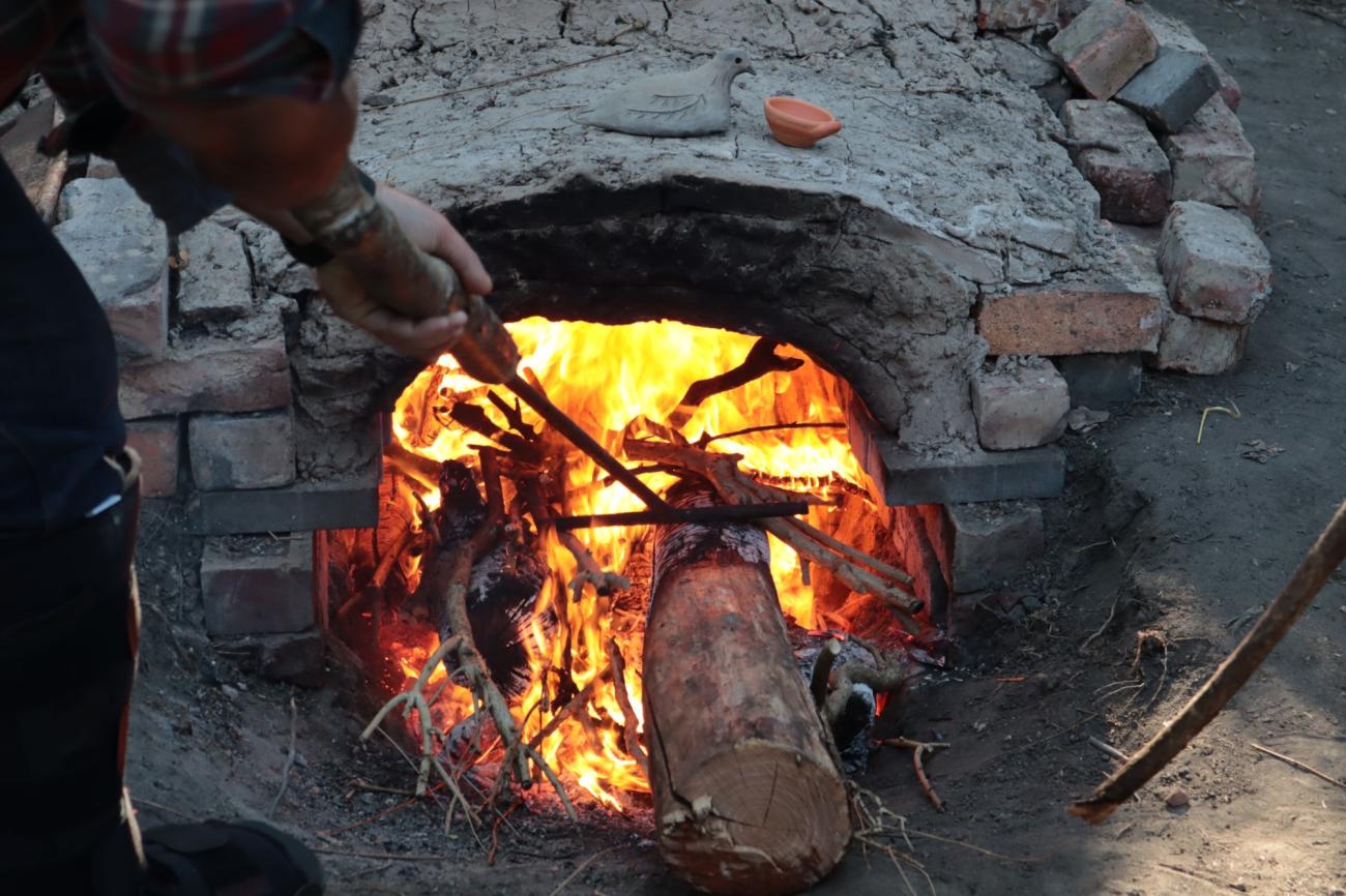 After three hours of prudent feeding, we reached a heat above 200°C, so we decided to add more branches and solid logs to keep a constant increase in temperature. As we proceeded, we pushed more and more red ashes with the T-shaped rod into all sides of the combustion chamber (See Figure 25). We continued operating in this way for the next four hours until we reached an average temperature of ca. 700°C. As temperatures were rising, we found that the clay cement dried out, forming many small gaps we had to cover with more clay to prevent heat loss.