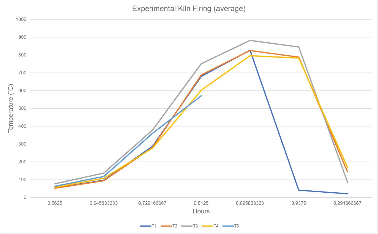 At temperatures above 150°C, we observed that despite spreading the ashes and flames evenly, the temperature measured by the thermocouples diverged quite remarkably and indicated that the northern and western sides of the firing chamber remained colder than the others. These sides of the kiln faced abundant vegetation that kept the soil more humid and, consequently, the kiln temperature lower. Direct observation of the kiln and the surrounding environment is important for potters to achieve a successful firing. By knowing the hottest or coldest areas of the kiln, they could arrange pots and manage fuel and fire accordingly.