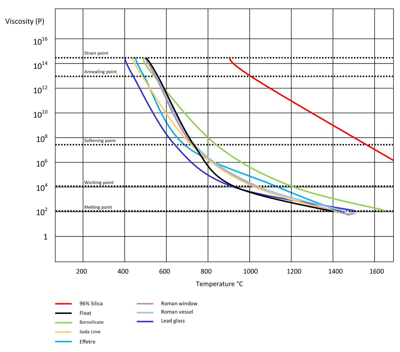 | Glass log viscosity | Strain Pt 14.5 | Annealing Pt 13 | Softening Pt 7.6 | Working Pt 4 | Melting Pt 2 | Reference |
