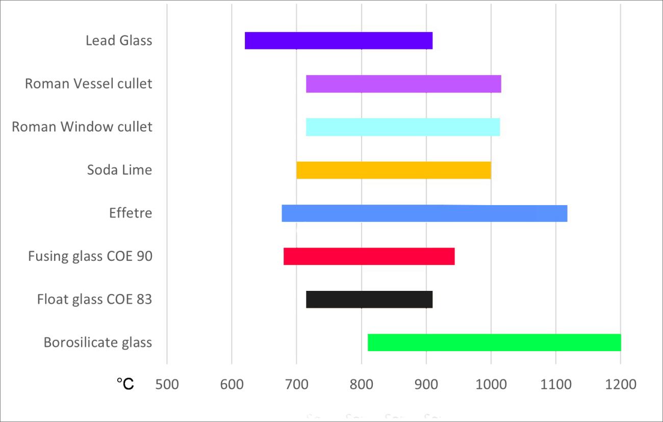 Figure 4 shows a range of different glasses and their viscosities at different temperatures. Silica glass needs the highest temperatures to reach the different points, and modern lead glass the lowest. A long shallow curve shows a long working range, and a more vertical curve shows a short working range, representing a relatively rapid change from the annealing point to the maximum working point. This is shown by the Effetre glass (turquoise line) in the early stages of heating. The Roman glasses (light blue and purple lines) are in the mid-range, along with modern soda lime glass (yellow), suggesting they are very similar.