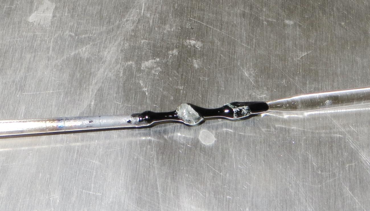 Step 6: The cooled glass, still attached to the clear rod, shows that the Roman glass was more viscous in the flame than the modern glass. Glass with a low viscosity will move further and become thinner; high viscosity will remain thick and resist being pulled (See Figure 23).