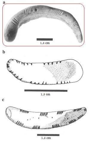 Among the Paleolithic ornaments are several Glycimeris sp. mollusc shells processed to obtain half-moons engraved with linear motifs. In 1999, three of these half-moons (See Figure 1) were analysed by M. Bisconti with the aim of reconstructing the operational chain related to their production: the hypothesis was that the half-moon was initially detached from the shell, producing the engravings in a second step which was followed by the polishing and the colouring of the object with red ochre (Bisconti, 1999, p.41).