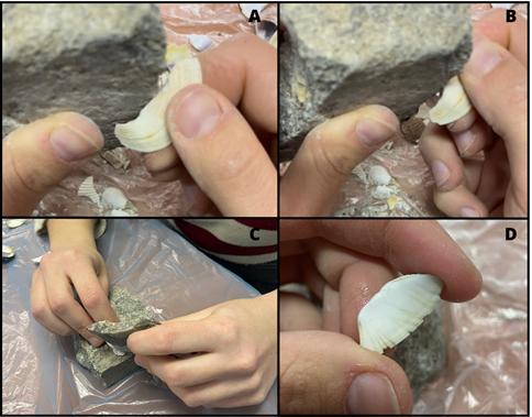 Step 1- Detachment of the half-moon: the shell was placed on the stone anvil, and then light blows were inflicted on the ventral part starting from the umbo (See Figure 3, A-B). From the middle part of the shell body onward, the processing required more care and caution to prevent the samples from breaking in half, making it impossible to produce a finished object.