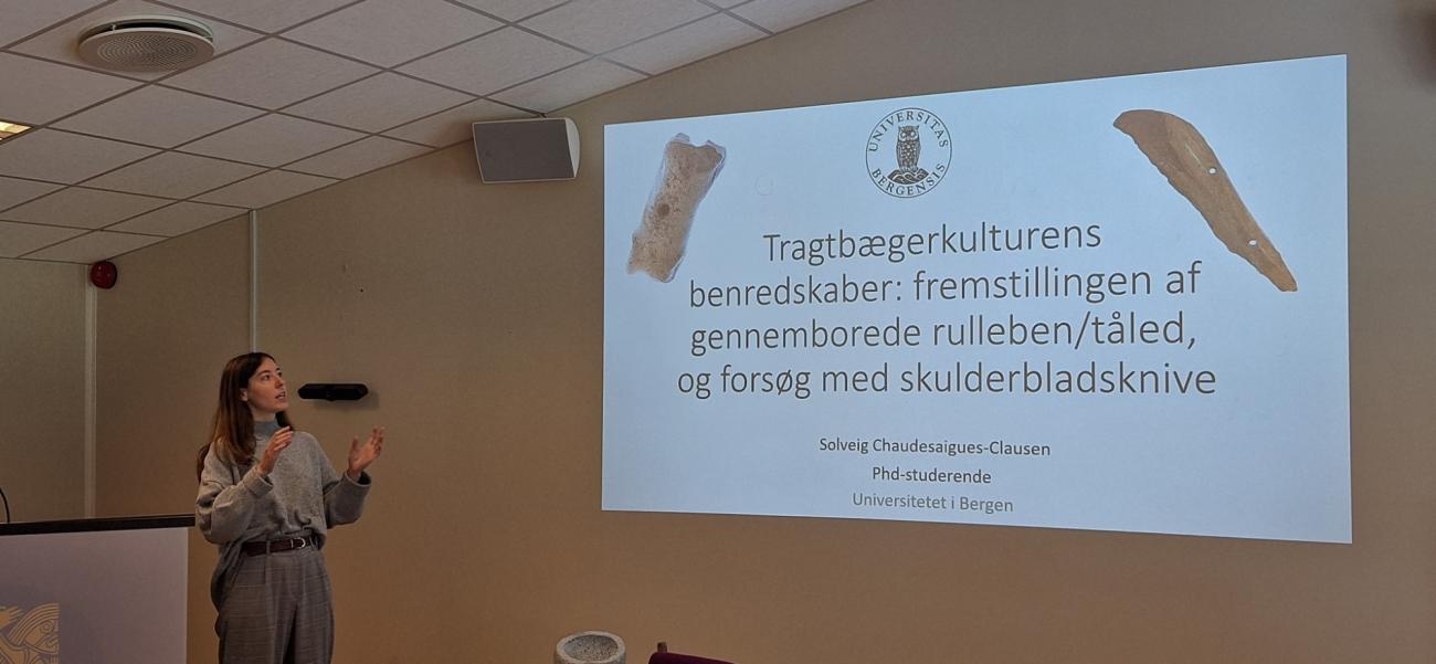 After lunch, Solveig Liv Chaudesaigues-Clausen, PhD candidate from the University of Bergen presented her research on stone tools from the Funnelbeaker culture. Her research involved experiments on the production of holes in Astragalus and Phalanx bones, and their possible uses. In addition, she had been experimenting with knives made from shoulder blades from cattle. The knives were surprisingly effective for various tasks, such as cutting small trees and grass.
