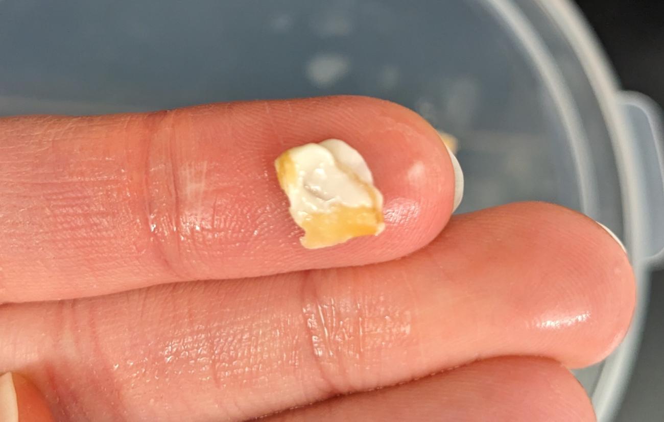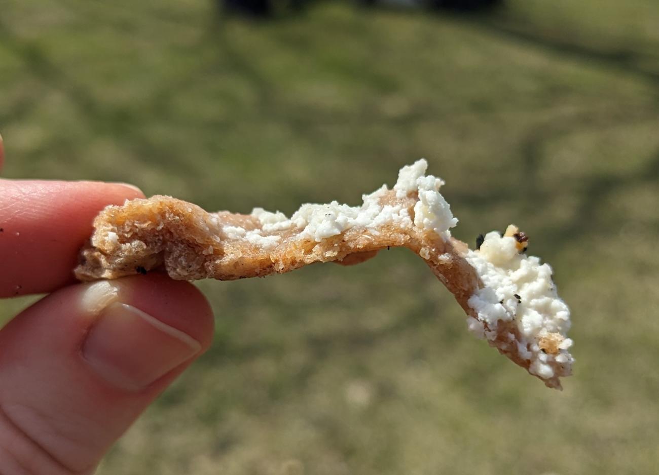 The two placentas clearly differed in appearance, composition, texture, and flavour. The outside of the placenta made with farro paste was glossy and crisp with a deep amber colour (See Figure 6), while the outside of the other placenta looked raw and felt soft despite being fully baked (See Figure 7). The placenta made with farro paste contained clearly defined layers of cheese and tracta, while in the other placenta the tracta had practically dissolved into the cheese mixture. When eating the placenta made with farro paste, the tracta acted as a toothsome complement to the soft cheese (See Figure 8), and everyone who tasted it agreed that this textual contrast was delicious, while the other placenta was unpleasant to eat because of its mushy texture.