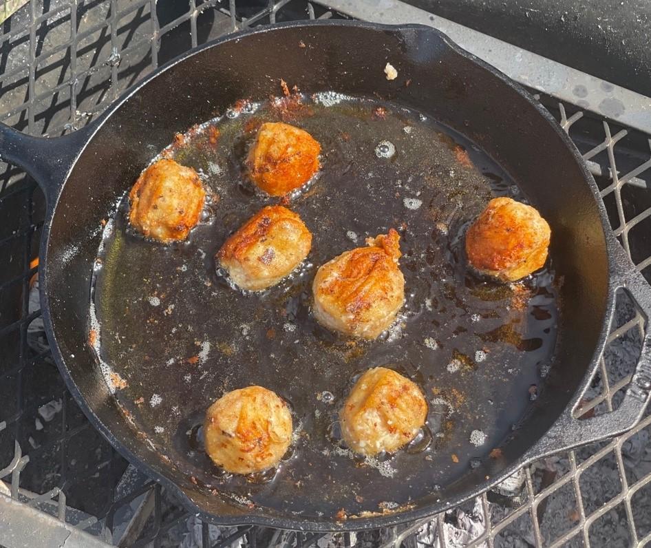 Cato also uses farro paste in two pan-fried pastries. To make globi (#79), Cato instructs the reader to "mix cheese and alica in the same way", presumably referring to the preceding placenta and variants recipes. This mixture is then to be formed into balls and fried in oil. Encytum (#80) differs from globi only in shape, with the mixture extruded into the hot oil, perhaps like a funnel cake. We combined feta and farro paste in the ratio of the placenta recipe (7:1), formed them into shape, and fried them in oil. Both pastries lost their shape and stuck to the bottom of the pan. However, when we fried a comparative batch made without farro paste and only emmer flour, it held together much better and did not stick, although the final product was quite dense. We found that using a mixture of half farro paste and half emmer flour made the batter hold its shape without being too dense (See Figure 11). Perhaps Cato intended the reader to combine "cheese and alica in the same way" as the ratio of flour to alica in the placenta recipe (2:1) and this reduced amount of cheese and moisture might make for more stability. Or, perhaps Cato's use of a harder brined cheese would have made for less moisture and allowed the 7:1 ratio to work.