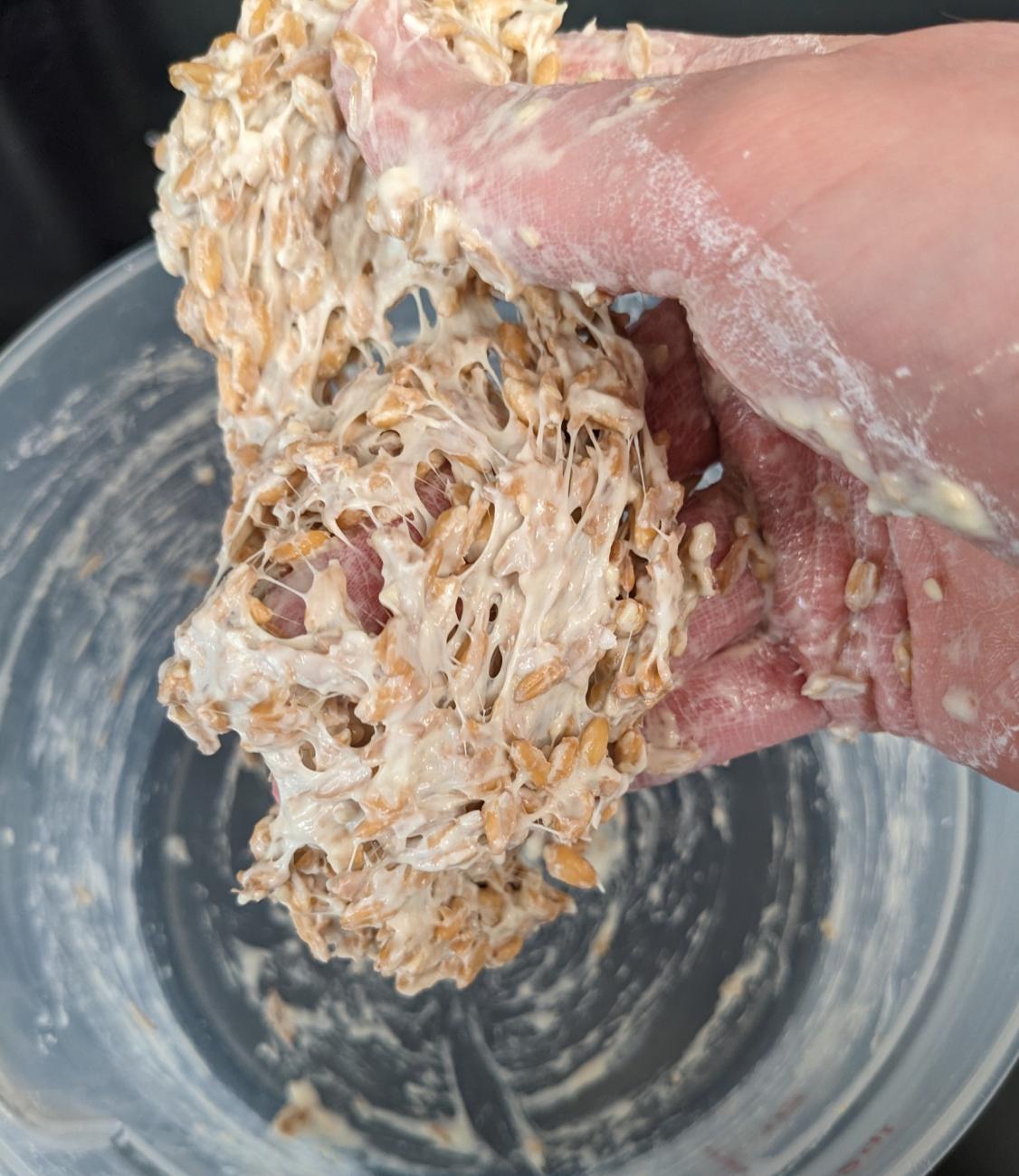 The other factor that alters the dough's hydration is the damaged starches which the farro paste add to the dough. Starch is a critical component of dough, and it is the heated, gelatinized starches that ultimately form the structure of the final baked bread. Starch is present in all wheat flours, primarily in the form of native starches which are intact and absorb water at their periphery. Some of the native starches present in the grain are inevitably damaged in the process of harvesting and milling the grain; this is significant because damaged starches absorb up to six times as much water as native starch particles. The addition of the farro paste likely increases the proportion of damaged starches in the dough significantly, as the starches are released (and damaged) in the process of mashing the soaked grain into a paste. By mixing those damaged starches into the dough, it will increase the dough's water absorption capacity.18
