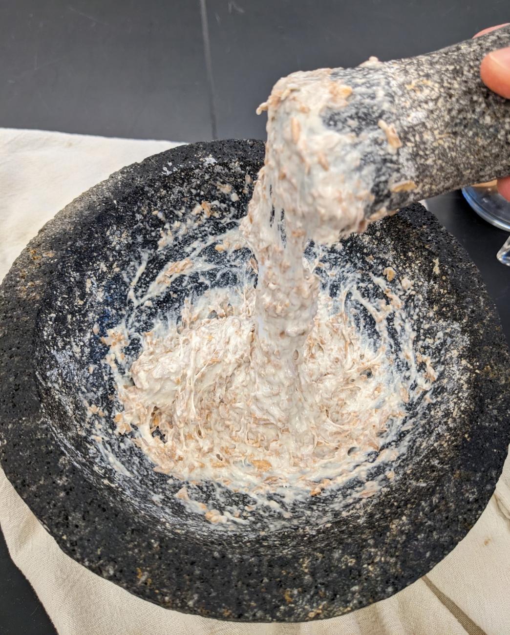 - Drain the soaked farro. Pound it in a mortar and pestle until it forms a sticky white paste, about five minutes. You can squeeze the farro by hand for a longer time if you do not have a mortar and pestle.