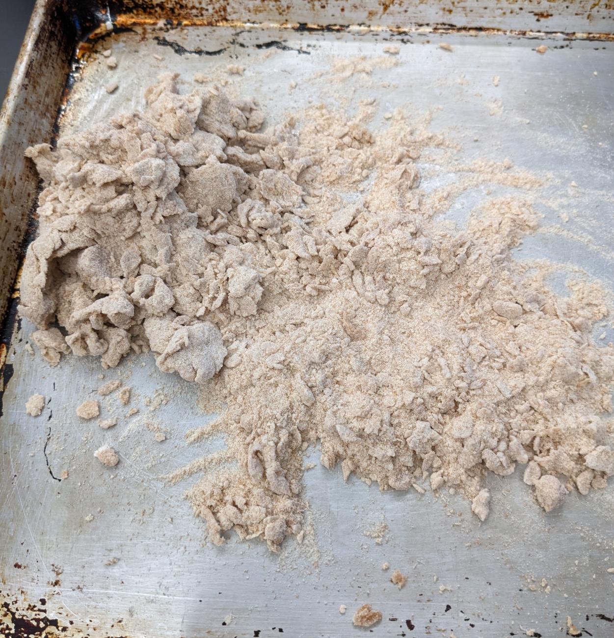 This step was initially perplexing because flour and farro paste combined in the specified ratio are too dry to create a dough on their own.6 The amount of dry flour left over when combining only these two ingredients is shown in Figure 4. However, this does not mean that the recipe cannot work. Cato's concise instruction "make tracta" seems to indicate an assumed knowledge on the reader's part.7 The late 2nd/early 3rd century AD writer Athenaeus tells us that tracta are made from the same ingredients as bread (Athenaeus, 1854, 113d), and bread was, and is, made from flour, water, and salt - a combination Cato specifies in #74, his simple bread recipe. We can reasonably assume that Cato expected his reader, at a time when commercial bakeries were still novel, to know to add water to dough to achieve a proper texture. Similarly, an experienced baker today would know to add water to a pie crust even when only given a ratio of flour to butter in the recipe. Therefore, we added water and salt to the flour and farro paste to form the tracta dough.