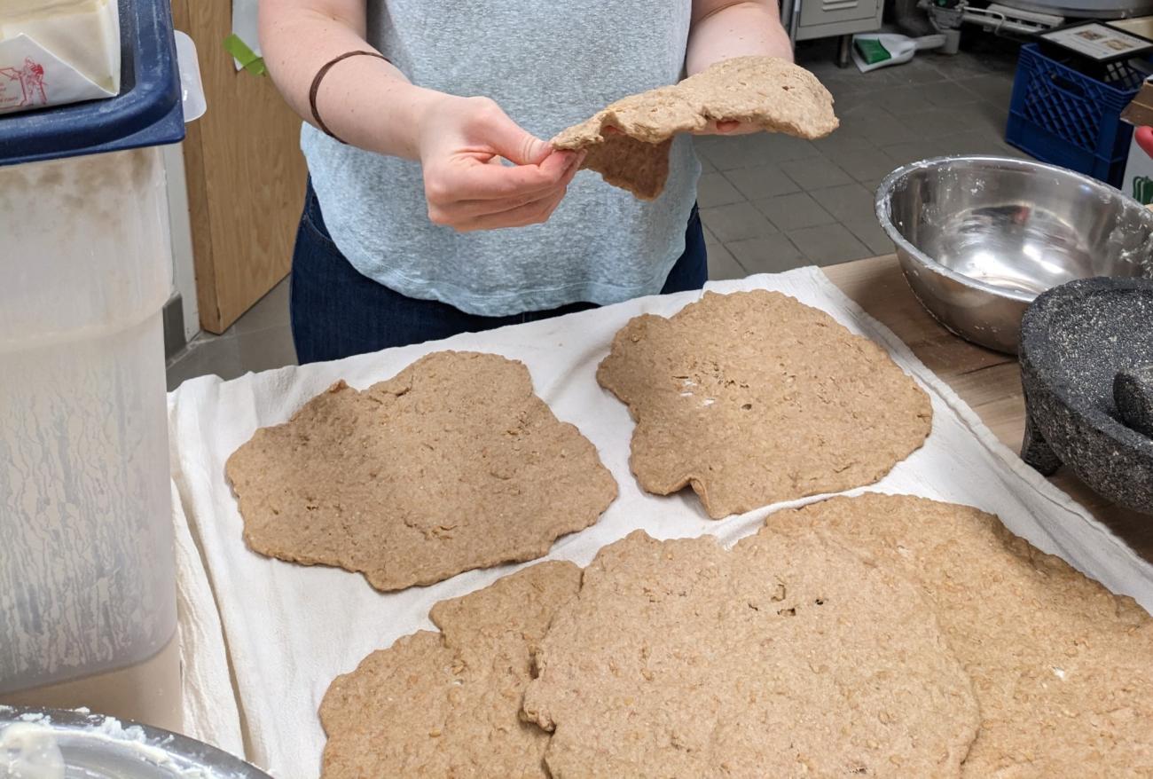 Once shaped into rounds roughly three milimeters thick (See Figure 5), the tracta were set aside to dry as instructed. To study the purpose of using farro paste in tracta, we made comparative batches of tracta in which we replaced the farro paste with an equivalent amount of emmer flour and water. We then baked both types of tracta in a 190℃ oven10. Both kinds of tracta were fully baked after 11 minutes, but the tracta made with farro paste were chewier, tougher, and denser. The smashed farro thus seemed to add only qualities undesirable in a loaf of bread. However, when used in the placenta as intended, we will see that these same traits became beneficial.