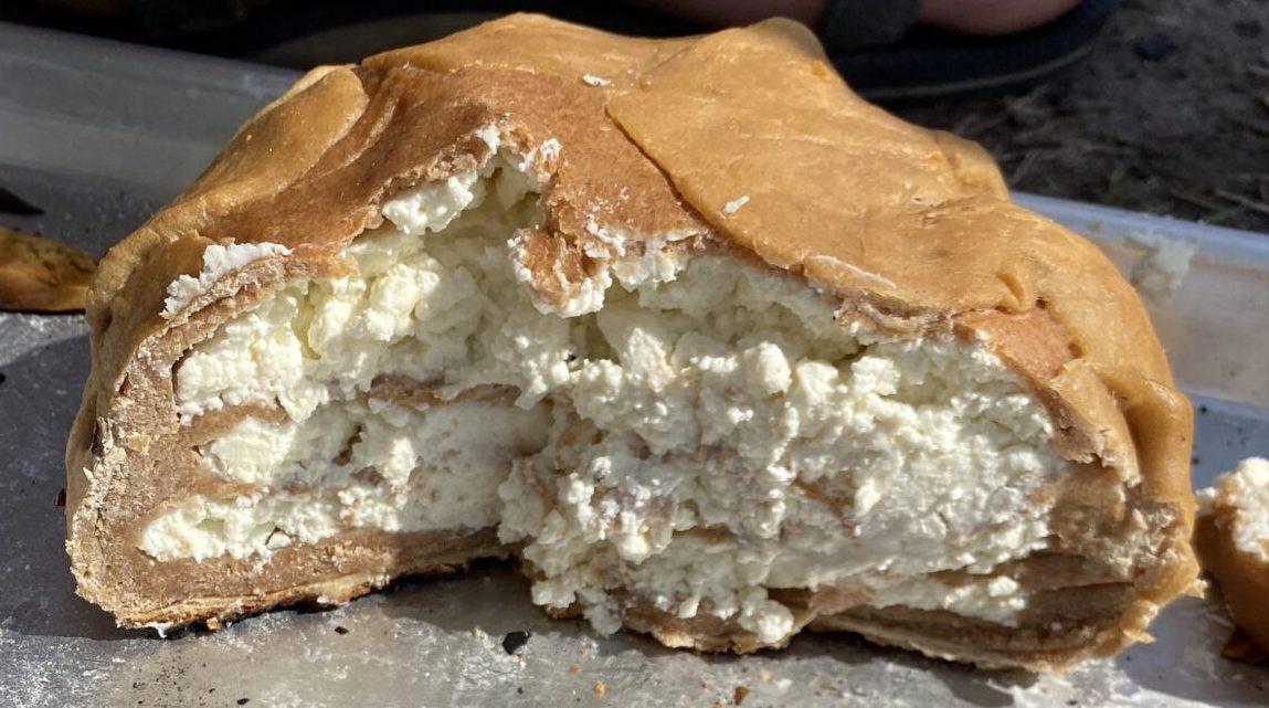 - Stretch (or roll) the crust dough until it forms a thin round that can comfortably fit the tracta with extra dough that will be used to wrap over the tracta/cheese layers. Place on top of the bay leaves on the baking sheet.