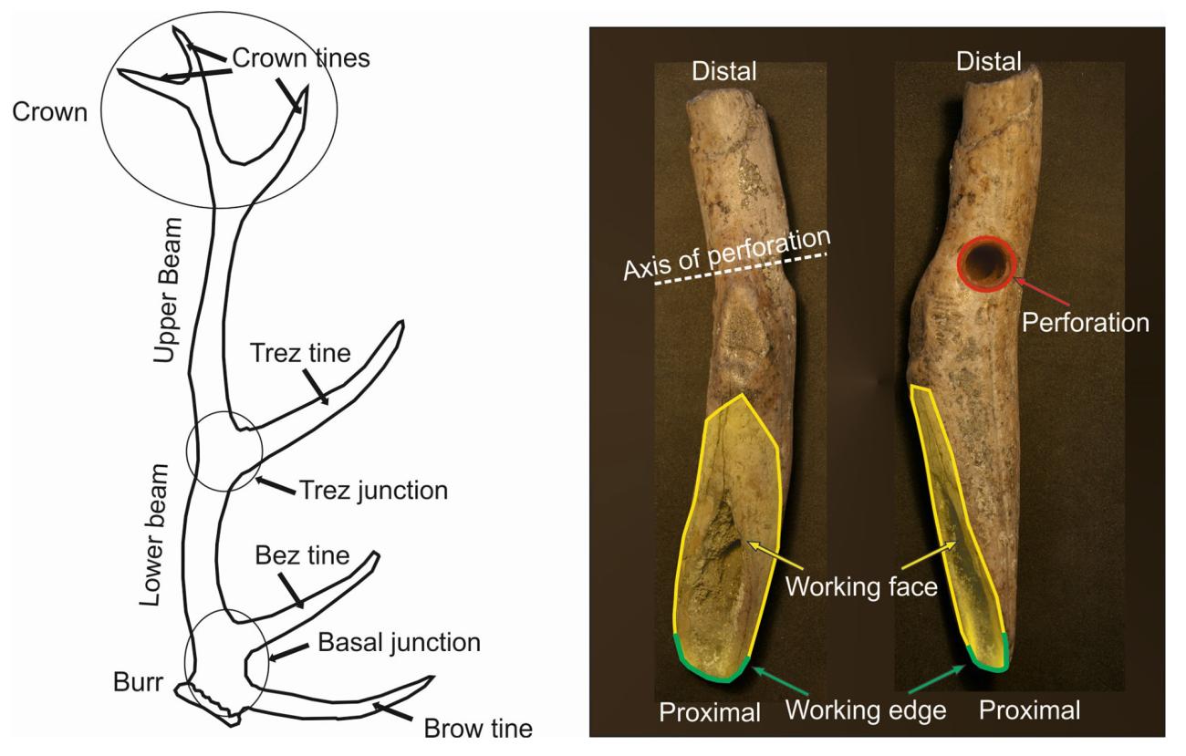 'Heavy tools' made from the antler of red deer are characteristic of Early Holocene hunter-gatherer groups throughout Europe north of the Mediterranean. These artefacts are identified by (i) a working edge created by an oblique truncation of the antler beam; and (ii) a perforation, roughly circular or oval in plan with a greatest width of around 2-3 cm, created through the full width of the antler beam to facilitate hafting (Smith, 1989, p.272; see Figure 1). Objects matching this description have been referred to in the literature as (T-)axes (for example, Riedel, Pohlmeyer and Von Rautenfeld, 2004), (hammer-)adzes (for example, Kabaciński, 2009), and mattocks (for example, Smith, 1989). 'Heavy tools' is used in the present study as a functionally agnostic term that captures all of these sub-types. Tools belonging to this broad category were utilised at various times in prehistory: direct radiocarbon dates from 17 British red deer antler heavy tools, for example, fell into two discrete clusters, one Mesolithic (circa 8000-4000 BC), the other Late Neolithic / Bronze Age (circa 2750-1200 BC; Tolan-Smith and Bonsall, 1998, p.254). They are, however especially important in Mesolithic material culture, with debates surrounding their manufacture, function, and social significance being crucial for our understanding of key issues in that period, such as the manner of transition from foraging to farming (Zvelebil, 1994) and the nature of intercultural contact and exchange (Czerniak, 2022).