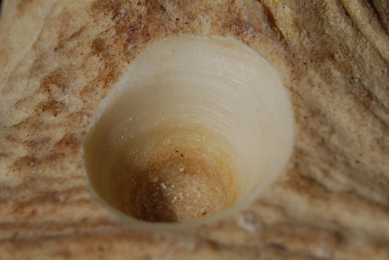 - Lithic tool thickness determined perforation morphology. A specific relationship was postulated: any tool with W:T ≤ 2 will produce a perforation that is circular in plan with a tapered profile, while a tool with W:T > 2 will produce a rounded polygon shape in plan and 'upside-down mushroom' profile. Can this hypothesis be supported or refined by further experiments? Among the limited sample studied, tool form was found to be not only an important variable but the only important variable in determining perforation morphology (with a single tool producing identical morphologies by hand boring and bow drilling on dry and soaked antler). Therefore, future studies should ask what other specific relationships can be identified between tool form and perforation morphology. What other properties of tools (besides W:T) are salient in predicting the shape of the hole they will produce?