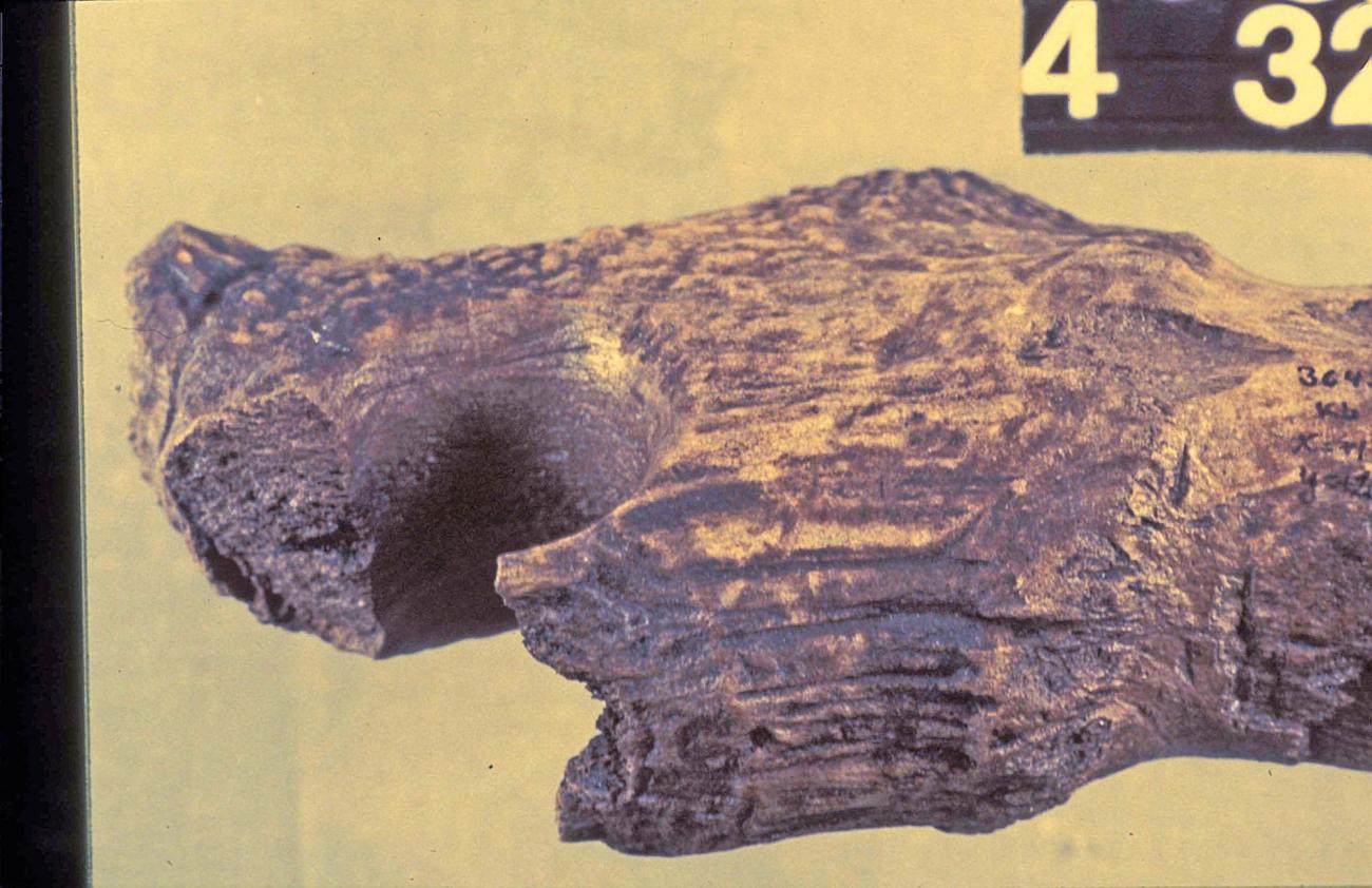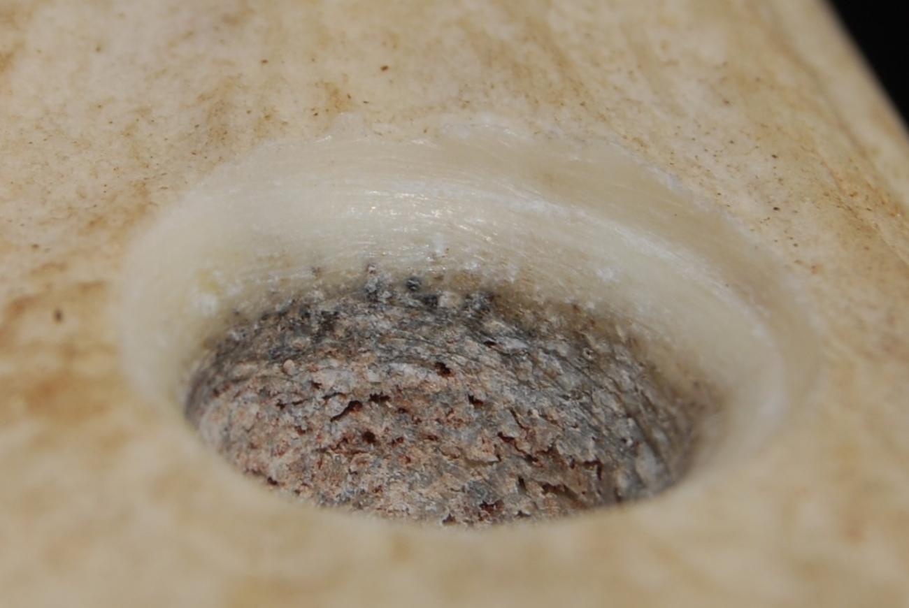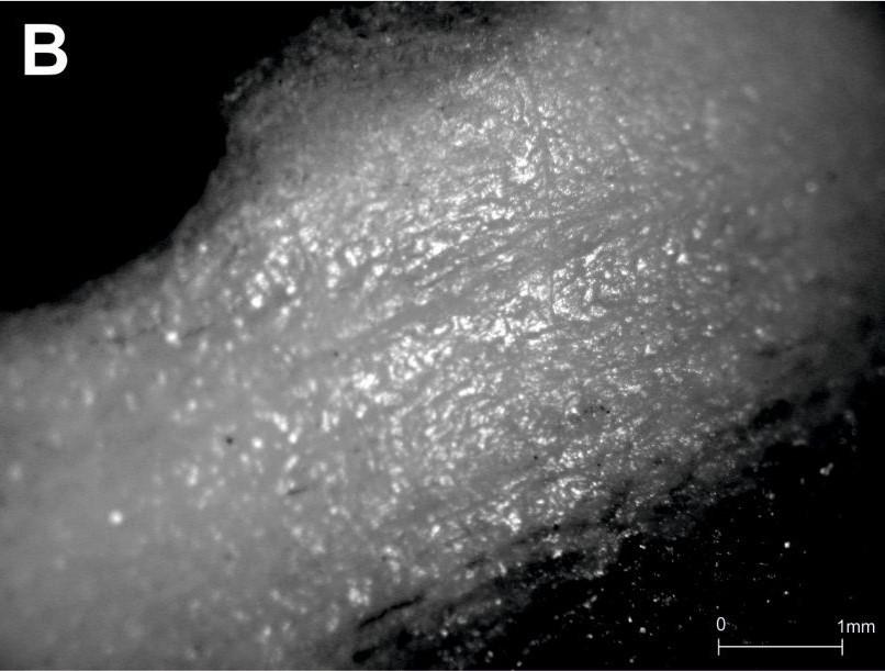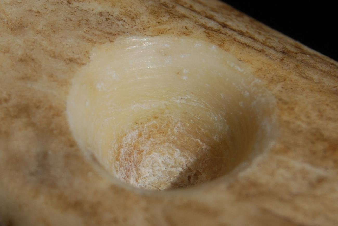 Hand-bored and bow-drilled perforations were readily distinguishable by the character of the striations observed on the surfaces, particularly of compact tissue, that had been abraded by the perforating lithic tool. Striations produced by bow drilling tended to be longer, horizontal, and parallel (See Figure 10), whereas those produced by hand boring tended to be shorter, oblique, and converging to intersecting (See Figure 11). In sum these differences amount to two quite distinct visual impressions, the striations on bow-drilled holes appearing very neat and regular, whereas those on hand-bored holes are rather messy. These differences are readily explained by the experiments. The mechanics of bow drilling are such that each single stroke of the bow, either back or forth, effects multiple full rotations of the drill bit in a single direction; when hand boring, each twist of the flint tool produces a rotation of at most around 180°. This explains the observed difference in the length of striations. Similarly, when bow drilling, an angle close to 90° is consistently maintained between the axis of perforation and the worked surface; but when hand boring, that angle is liable to vary slightly because the hand and wrist do not rotate perfectly about a fixed central axis. This explains the difference in the angle of striations.