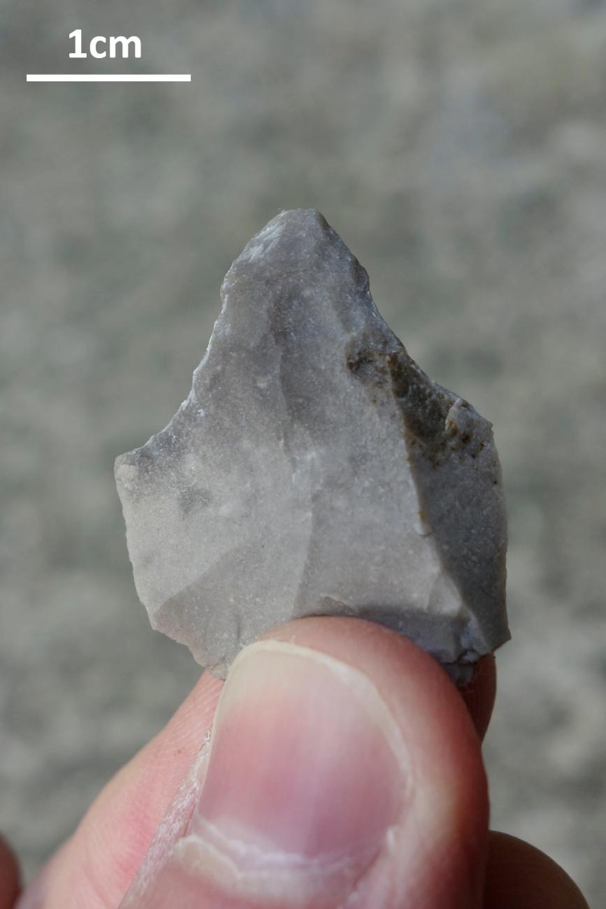 It is worth recording one final observation made during the course of the experiments, this time regarding use-wear on the tools themselves. Tools made from thin-flake blanks (and to a much lesser degree those made from thick flakes) followed a consistent pattern of breakage through use: the force of the hard compact tissue at the perforation opening abrading against the lateral edges of the tool caused tiny chips to be periodically removed from those edges as the hole deepened, resulting in the formation of concave lateral working edges terminating in distinctive 'shoulders', whose distance from the tip of the tool corresponded to the final depth of the perforation (See Figure 14). One lithic perforator from Dąbki (See Figure 8:5 in Kabaciński and Winiarska-Kabacińska, 2023, p.9) exhibits precisely this form, indicating that it may have undergone the described pattern of breakage.