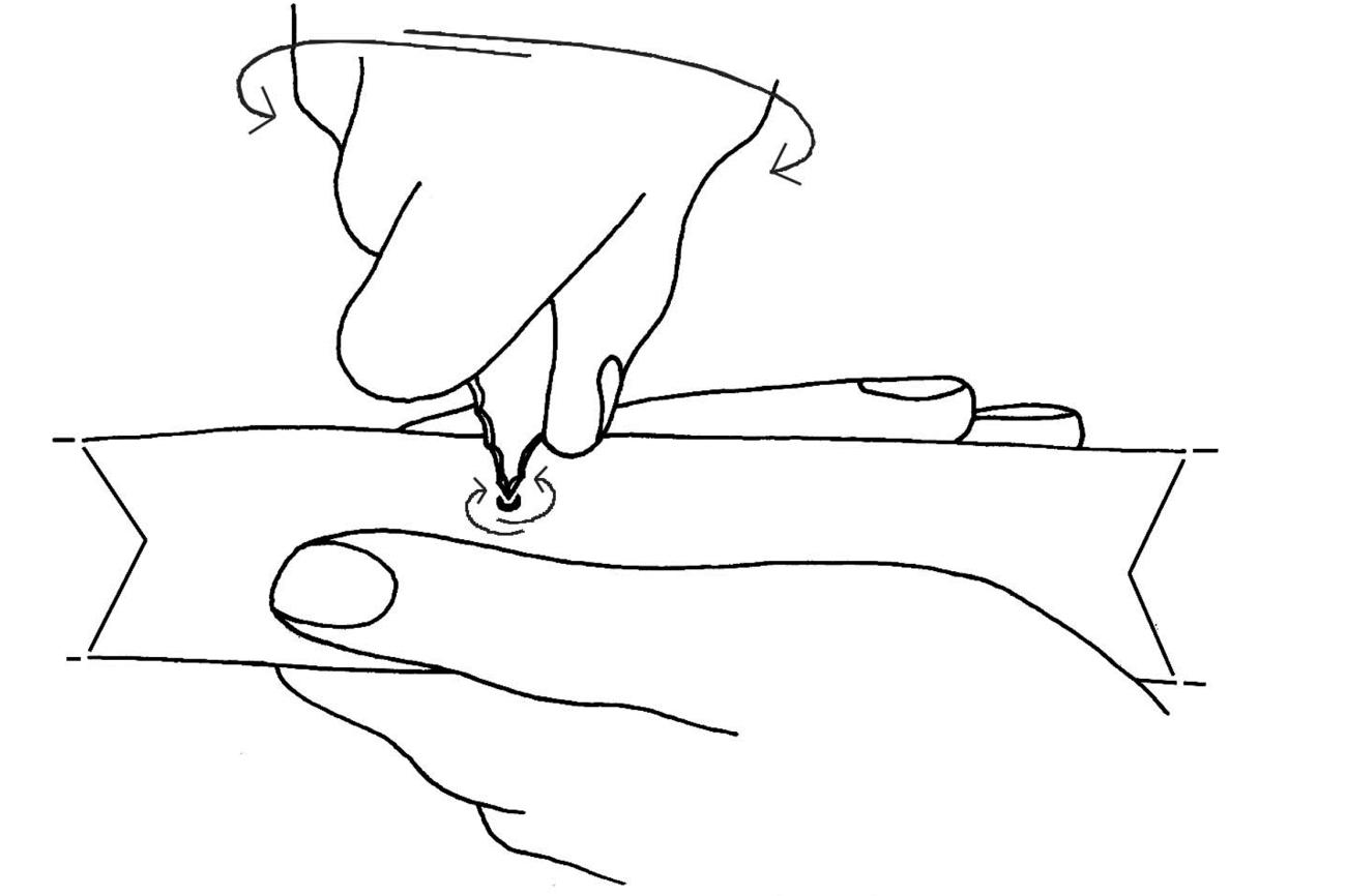 This conclusion provided the impetus for a series of experiments in which flint tools were used to perforate red deer antler. Rather than replicating specific lithic forms attested in the archaeological record, the decision was made to use the simplest possible form capable of doing the job; a simple flake, minimally retouched at the distal end so that it tapered to a central point. The aim of the experiments was to investigate the traceological consequences of manipulating specific technological variables. The first variable was the means by which the flint tool was set in motion, which was either by hand or using a bow drill. In hand boring, the point of the flint tool was pressed into the surface of the antler and, applying continuous downward pressure, rotated alternately clockwise and anticlockwise by hand until a hole was produced (See Figure 5). In bow drilling, the flint tool was hafted onto a drill shaft of wood that was then set in rotary motion using a bow, with the flint drill bit inserted into the antler (See Figure 6). These are essentially the first two of the three perforation techniques identified by David (2008, pp.83-90) and discussed above using her terms 'boring' and 'drilling'. It was considered important to revisit these already-documented techniques in order to test the repeatability of the reported results and to see if they could be further refined.