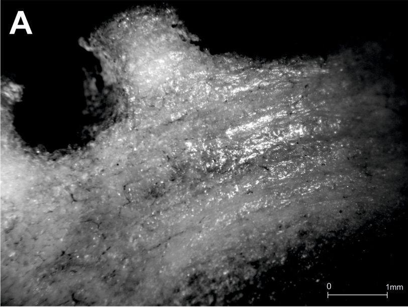 More recently, Orłowska (2015) investigated a different set of three perforation techniques in an attempt to replicate experimentally the cylindrical perforations observed in red deer antler heavy tools from the Neolithic of Northern Europe. She used a more sophisticated fixed drilling apparatus to operate a drill shaft to which she attached in turn three types of drill bit: two core drill bits, of hollowed-out black elder shoot and pig metatarsal respectively, and a solid drill bit of flint. All three were found to produce holes of "almost ideally cylindrical shape" (Orłowska, 2015, p.9). Orłowska describes the traces observed on the perforation walls (See Figure 4): for the bone drill bit, "decomposing stacked linear traces of variable width, consisting of pits and polishing caused by friction of sand grains" (Orłowska, 2015, p.7); for the wood drill bit, "a different size of pitting and polishing, which creates distinct bundles of striae (of different bandwidth)" (Orłowska, 2015, p.8); and for the flint borer, striations that are "highly regular and evenly distributed, forming relatively wide linear traces situated one over another" (Orłowska, 2015, p.9).