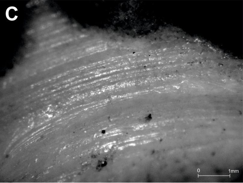 No previous study has explicitly proposed a way of distinguishing traceological evidence between hand boring and bow drilling on the basis of striations. Elliott notes that hand-bored perforations often exhibit "fine, circular striations" (Elliott, 2012, p.53), and that bow-drilled perforations similarly have "small internal striations caused by the circular action of the shaft" (Elliott, 2012, p.54). He is not explicit as to whether hand-bored and bow-drilled striations are diagnostically different, but the similarity of the two descriptions suggests that they are not. On perforations made using a hafted flint drill bit and drilling apparatus, Orłowska recorded striations that were "highly regular and evenly distributed, forming relatively wide linear traces situated one over another" (Orłowska, 2015, p.9; see Figure 4c). These appear to be very similar to the parallel striations produced by bow drilling in the present experiments (See Figure 10). David (1999, pp.687-688) describes striations produced by hand boring as circular and parallel to converging, those made by bow drilling as circular and parallel. The distinction between convergent hand-bored striations and parallel bow-drilled ones is consistent with the results of the present study. But David does not report the other traceological distinctions here noted, such as that hand-bored striations are also shorter, more frequently intersect, and generally appear messier than bow-drilled ones. In fact, her (and Elliott's (2012, p.53)) description of hand-bored striations as circular appears to contradict the findings of the present study, according to which those striations are always shorter than the full circumference of the perforation walls, and therefore not circular. These findings help to fill out the to-date rather thin body of traceological data characterising hand boring and bow drilling, adding detail that variably compliments and contradicts previous contributions.