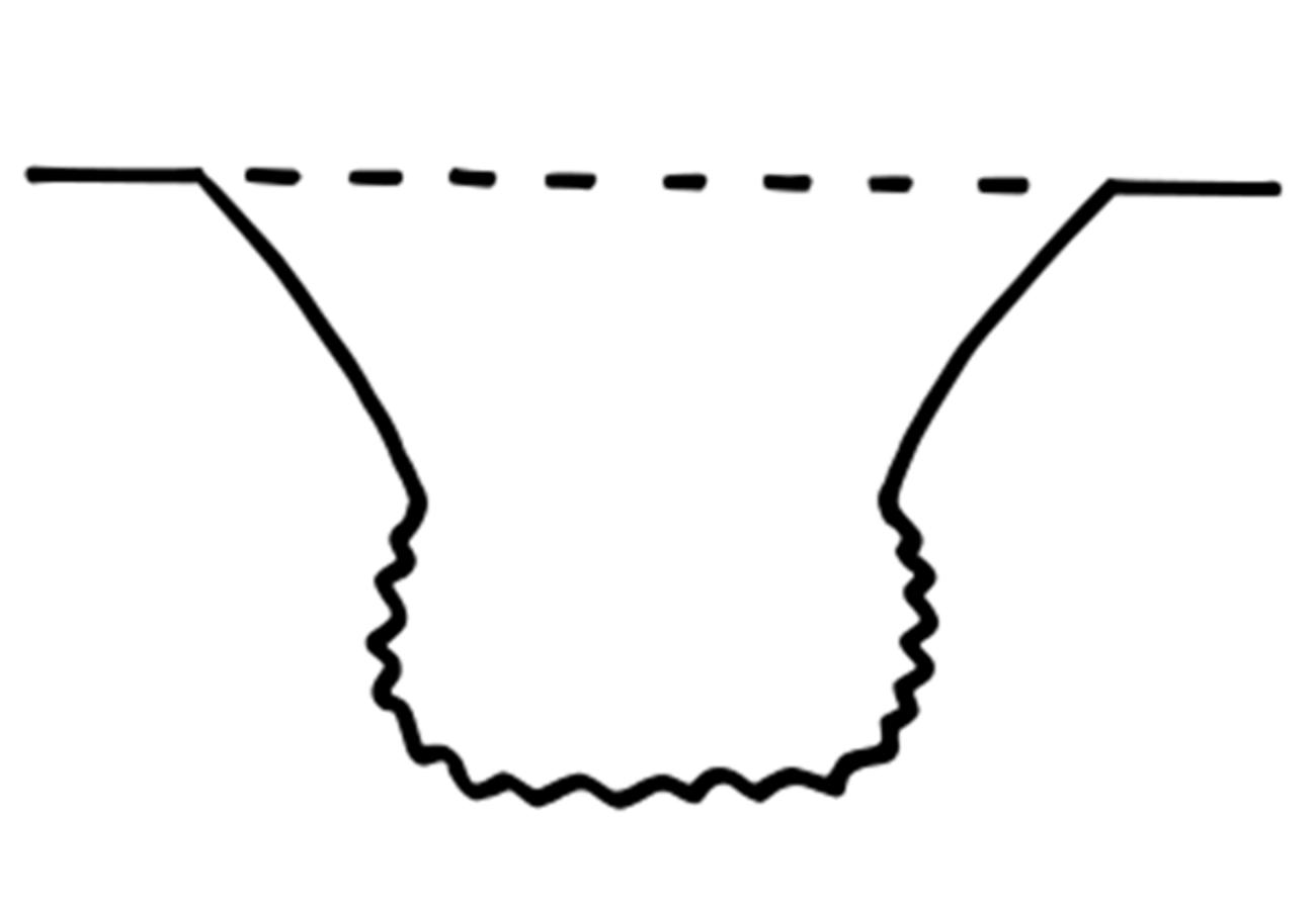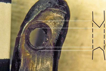 By contrast, when the tool has W:T > 2, it has only the two lateral edges in continuous contact with the perforation walls (See Figures 13a-c). This was found to make the tool inherently unstable when drilling or boring: the axis of perforation was not kept constant at 90° but tilted regularly, and the tool frequently became dislodged, especially when bow drilling. These problems began to manifest once the perforation reached a few millimetres in depth, and they increased as the depth increased. This resulted in a very consistent pattern in the course of the experiment: boring or drilling started smoothly, but once a certain depth was reached the tilting of the axis of perforation and consequent uneven abrasion around the perforation walls resulted in the formation of angles in the circumference of the hole, which became more pronounced as the experiment continued. These corners made it increasingly difficult to rotate the tool within the hole, and ultimately made further bow drilling impossible (though it was always possible, if laborious, to complete a perforation by hand boring). This consistent pattern of difficulties produced perforations conforming to morphological type B (See Figure 8): the formation of multiple corners resulted in a hole with a rounded polygon shape in plan, while the upside-down mushroom profile is thought to result from the erratic tilting of the axis of perforation, which caused the tip of the tool increasingly to gouge material laterally from the spongy tissue of the perforation walls as the hole deepened and the axis of perforation became increasingly unstable