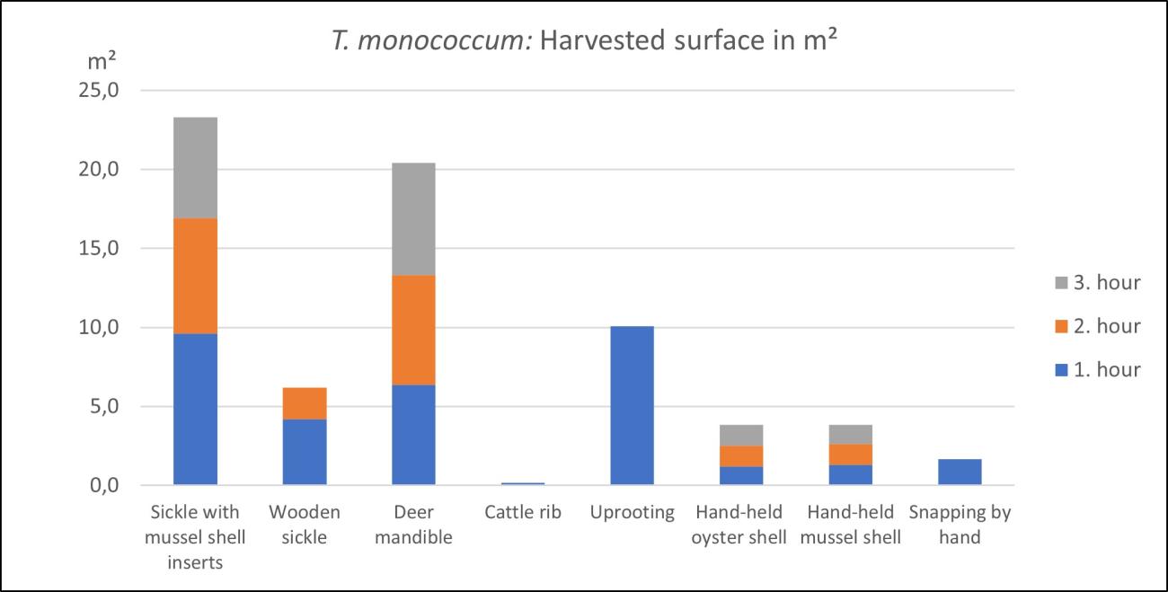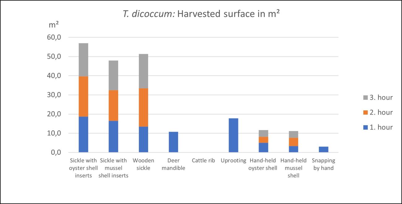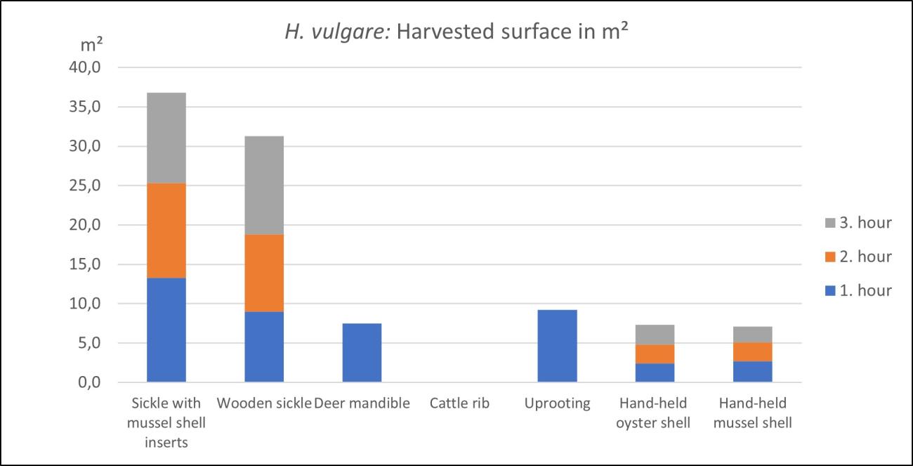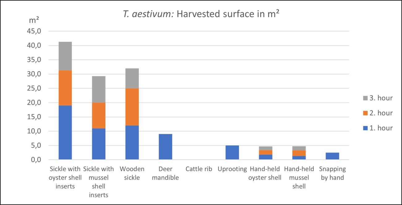 Triticum aestivum, was collected with nine different tools. The hafted sickles with oyster or mussel shell inserts and the wooden sickle achieved the best results with at least 29 m² surface reaped within three hours. With the deer mandible, it was possible to harvest 9 m² within one hour. This means an extrapolated 27 m² reaped within three hours. The uprooting of stems contributed to 5 m² of harvested surface or computed 15 m² for three hours. With the hand-held oyster and mussel shells and by hand not even 5 m² could be collected within 3 hours. The worse results were recorded with the cattle rib. Reaping had to be stopped after a few minutes, as the tool became blunt very fast and did not cut through the stems after that (See Figure 8).