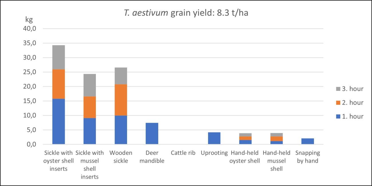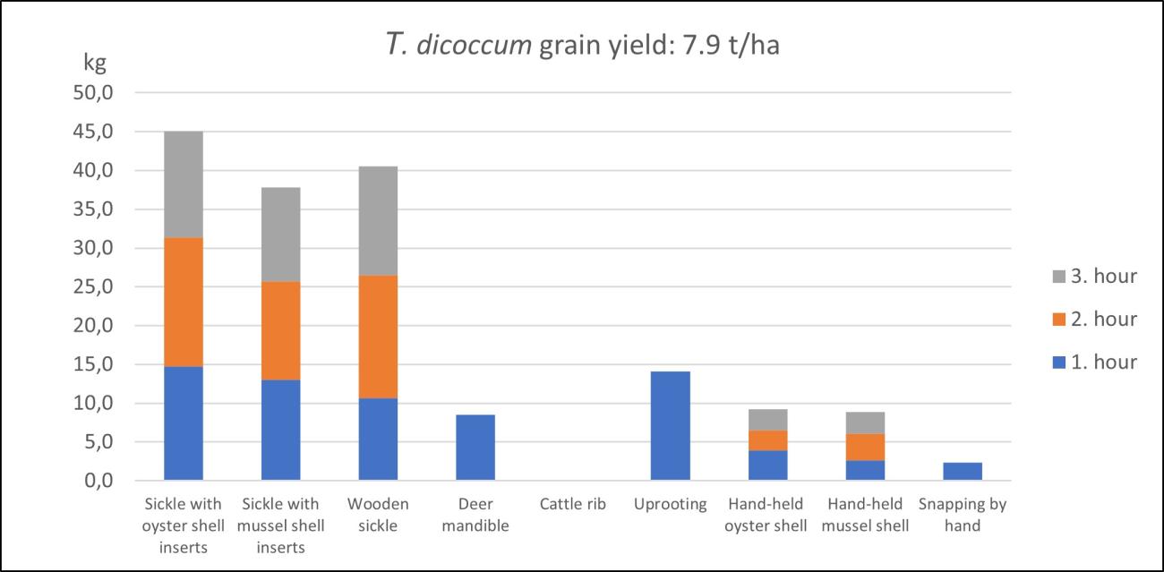 The grain yield of Triticum dicoccum was reported with 7.9 t per hectare slightly lower than the above Triticum aestivum. Reaping with a hafted sickle with oyster shell inserts resulted in a maximum of 14.77 kg of grain harvested per hour. With a wooden sickle or a deer mandible, around 10 kg of grain could be collected per hour. Handheld tools resulted in around 2-4 kg of reaped grain (See Figure 11). However, this grain consisted only of ears, making it easier to use at a later stage.