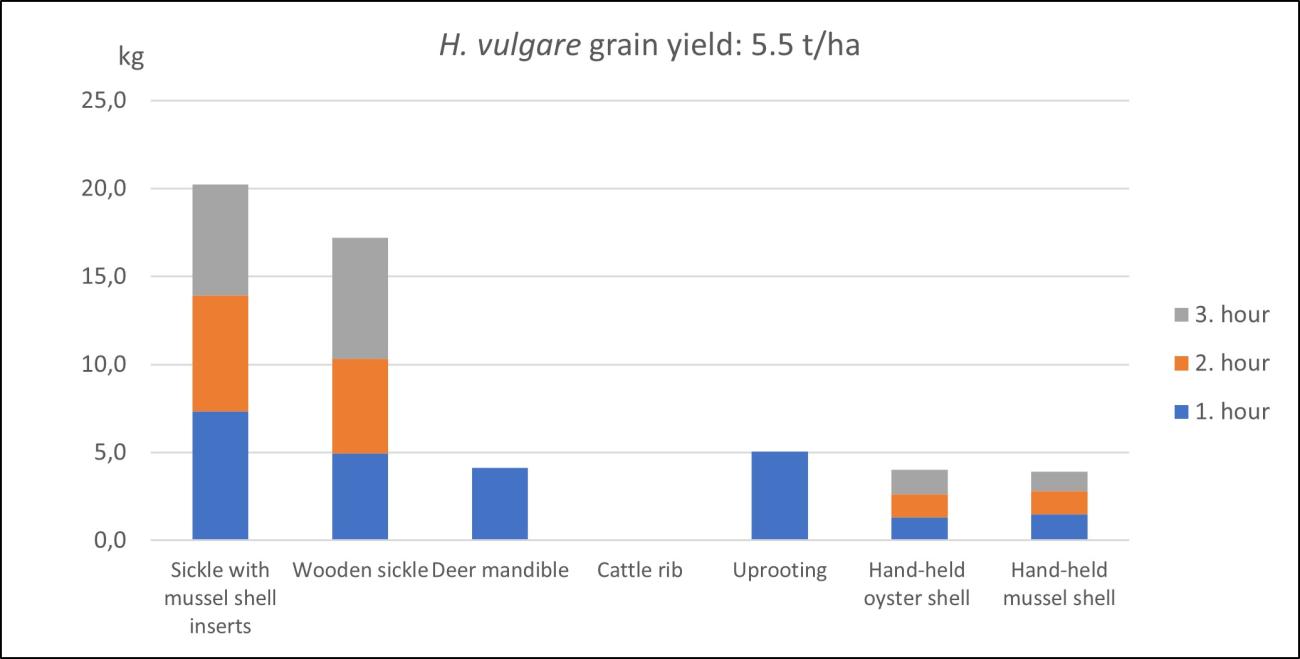 The grain yield for Hordeum vulgare is significantly lower than compared to Triticum aestivum and Triticum dicoccum. As such, the harvest with a hafted sickle with mussel shell inserts resulted in a yield of only 7 kg of grain per hour, about half compared to the same tool with Triticum dicoccum. With hand-held shell tools, it was possible to collect close to 1.5 kg of cereals (See Figure 13).
