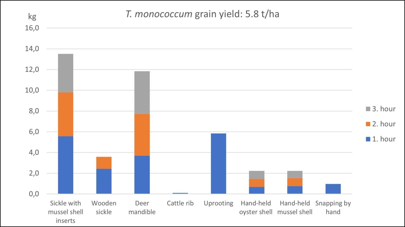 The grain yield achieved by each tool for Triticum monococcum is among the lowest of all tested cereals. It reaches close to 6 kg of grain per hour by means of uprooting or with a hafted sickle with mussel shell inserts. With the deer mandible, a maximum of 4 kg can be collected. The use of handheld shell tools results in less than 1 kg of grain collected per hour. This is due to a combination of a low yield and a small, reaped surface (See Figure 15).