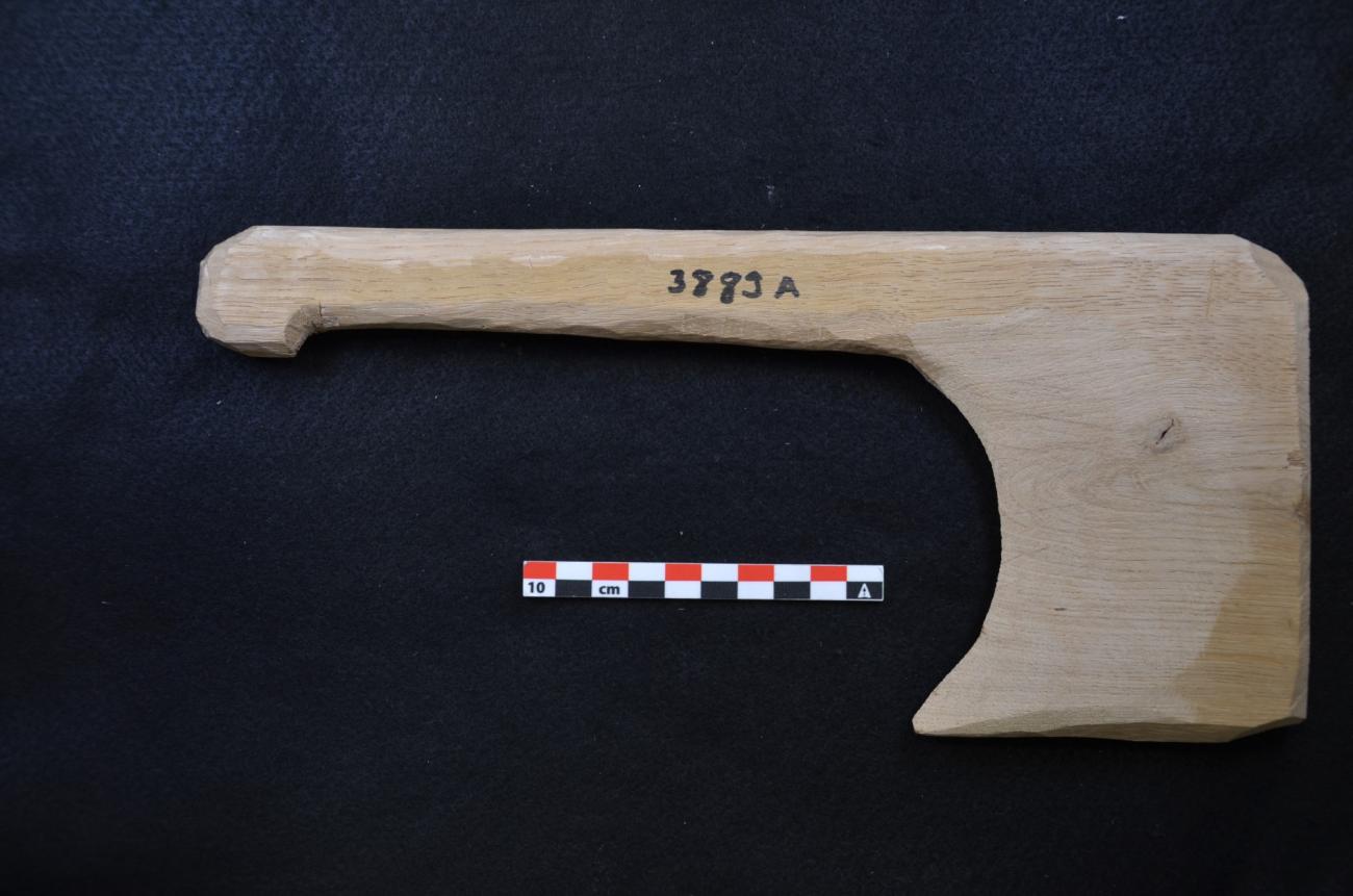 These sickles follow closely the shape of an archaeological tool found at the site of La Draga, Girona, Spain. This site, dating to the 6th millennium BC (Bosch Lloret, 2006), yielded many wooden tools preserved in a wet environment. One of these items, made of oak (Quercus sp caducifoli), has been classified as a sickle used for cutting reed and cereals (Terradas, et al., 2017). So far, it is the only discovered wooden tool believed to have been used to gather cereals. The experimental tools were accordingly 30 cm long, 14 cm wide and 2 cm thick and made of oak wood. They have a long handle to grasp the sickle comfortably and a curved cutting edge . The cutting-edge ends in a point, where cereal stems can be gathered (See Figure 3).
