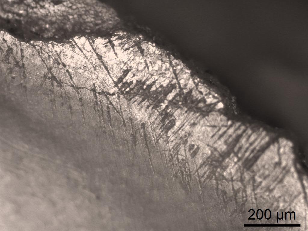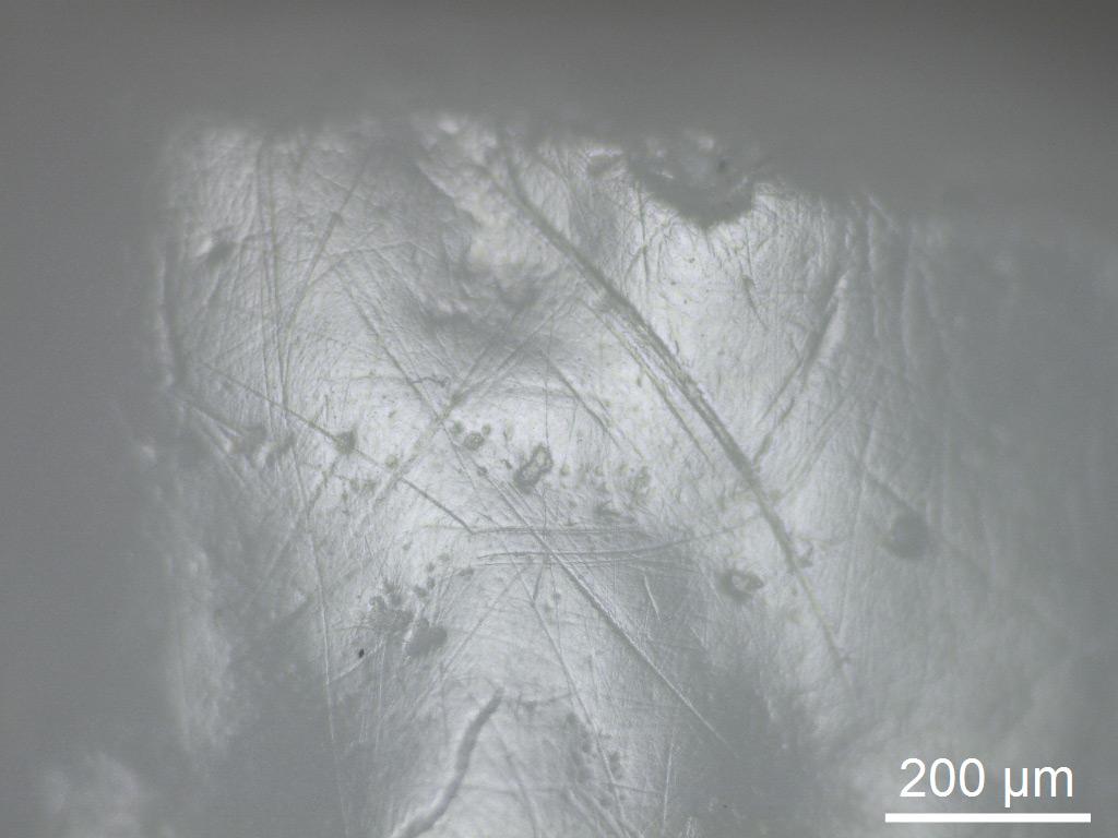 Before and after the harvest, all reaping tools were analysed under a stereo microscope. For that, a Leica M 80 instruction microscope was used. The microscope was connected to a Leica MC 120 HD camera to provide a digital picture. The pictures were taken at three magnifications (7.5x, 25x and 60x) with a scale bar of 2 mm (for 7.5x), 1 mm (for 25x) and 500 µm (for 60x). Also, a metallographic microscope was used to analyse the different tools at higher magnifications. For that, a Leica DM 2700 M metallographic microscope together with a digital camera Leica MC170 HD was employed. Pictures were made with two magnifications (100x and 200x) and saved with a 200 µm (for 100x) and a 100 µm (for 200x) scale bar.